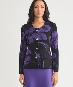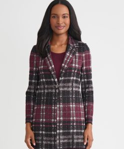Misook Women’s Heritage Checkered Trim Knit Jacket – True Fit | Concord Purple & Black & New Ivory