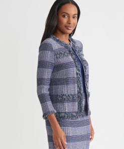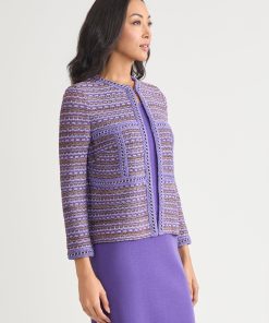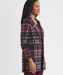 Misook Women’s Heritage Checkered Trim Knit Jacket – True Fit | Concord Purple & Black & New Ivory