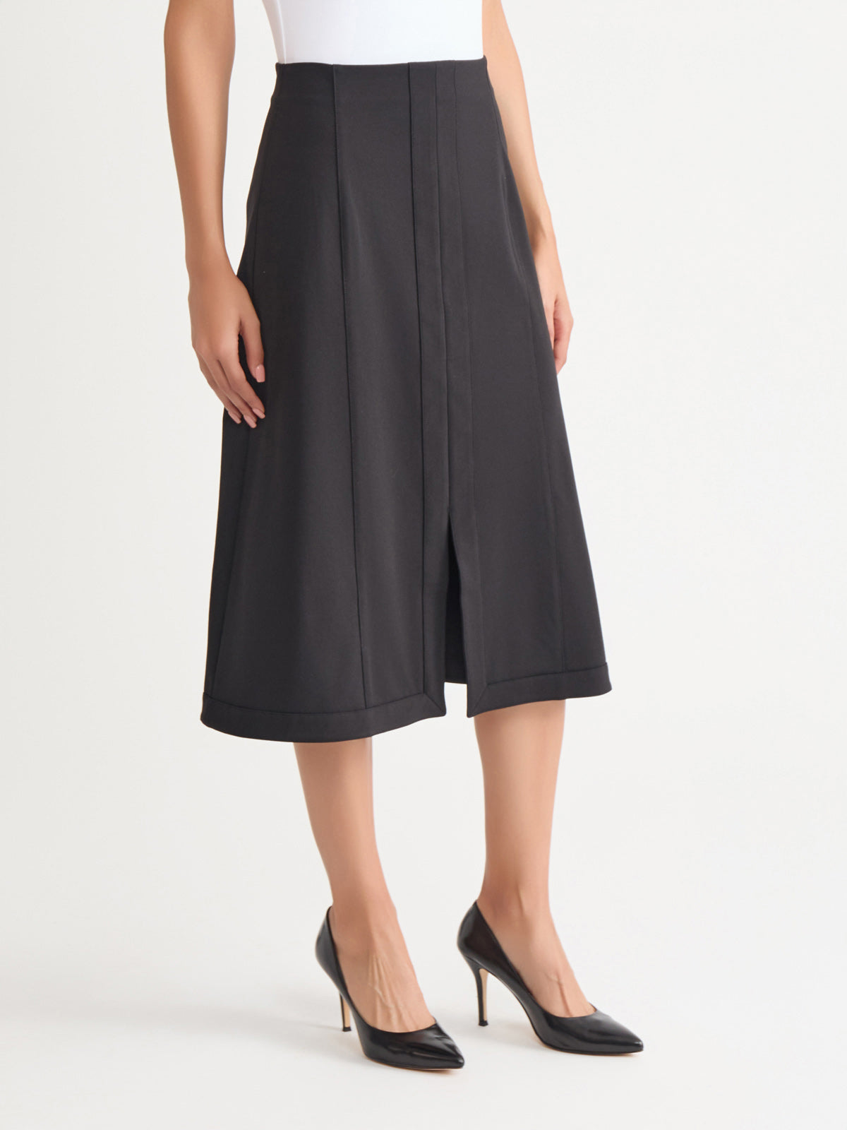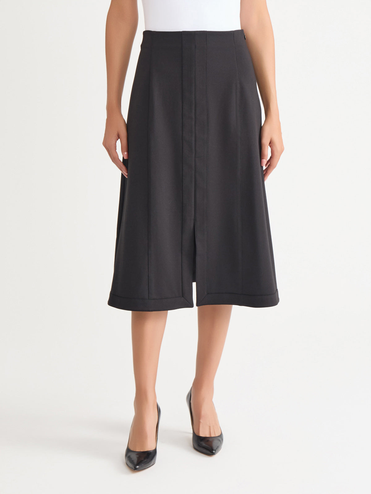 Elevate your wardrobe with this versatile and stylish A-Line Stretch Ponte Midi Skirt. Designed with a tonal colorway that adds a sophisticated touch, this skirt effortlessly transitions from day to night. Crafted from a high-quality stretch Ponte fabric, it offers a flattering, comfortable fit that moves with you, making it an ideal choice for both work and evening events. Pair this iconic skirt with one of our matching Ponte jackets for a complete tonal look.