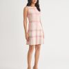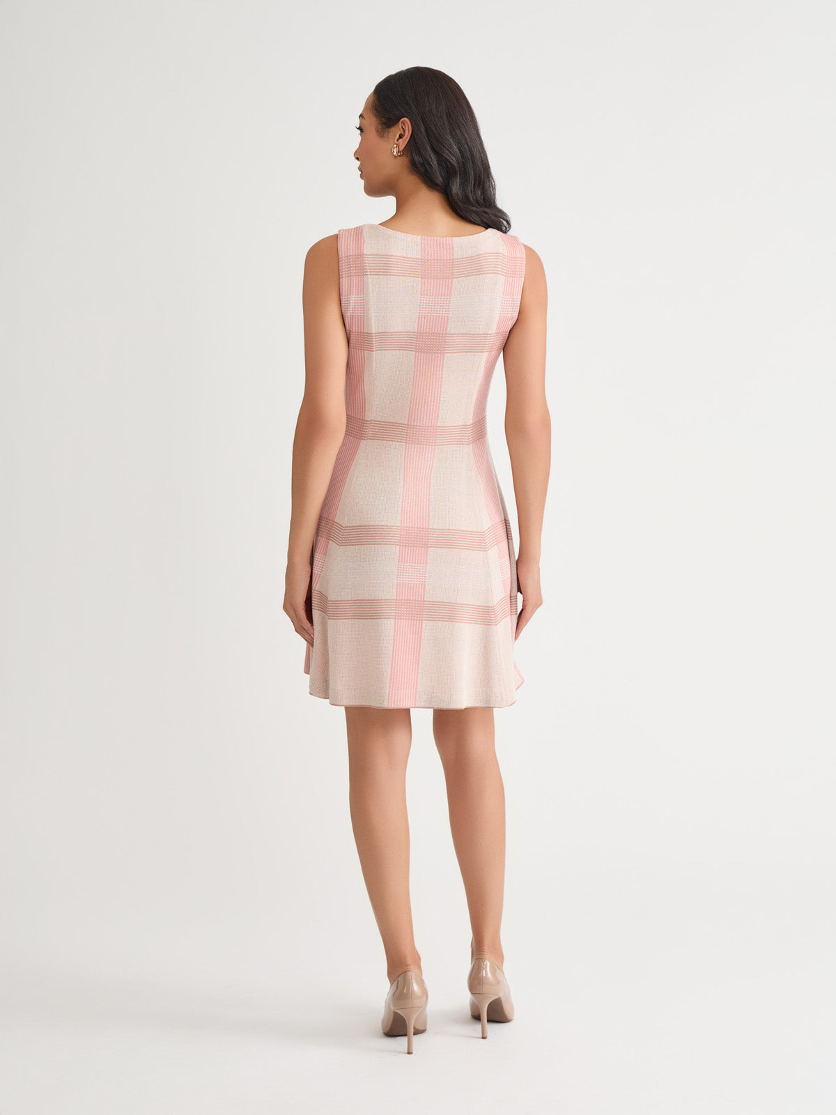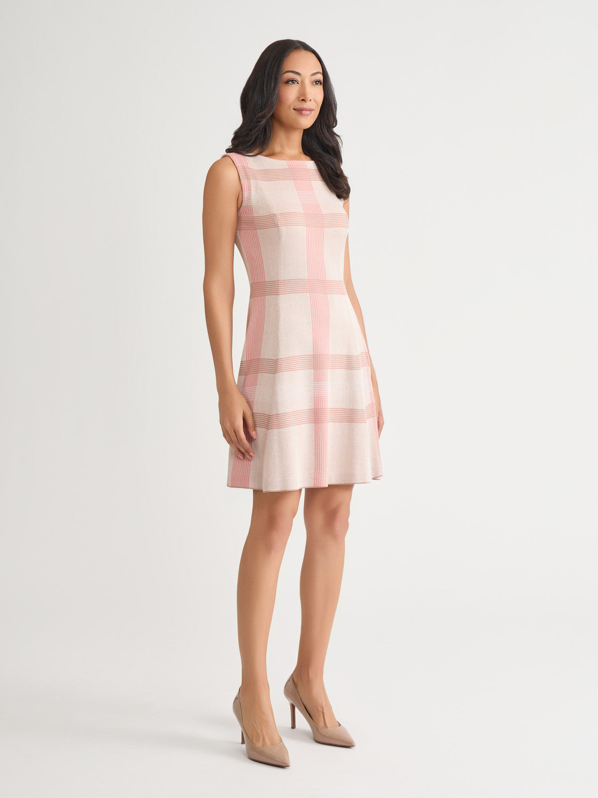 The A-Line Multi-Color Plaid Knit Dress combines timeless plaid with a flattering a-line silhouette for a chic, feminine look. Crafted from wrinkle-resistant plaid knit fabric, this dress offers both style and comfort. Featuring a boat neck, princess seaming for a tailored fit, and a sleeveless design, this dress is perfect for any occasion, from casual outings to evening events.