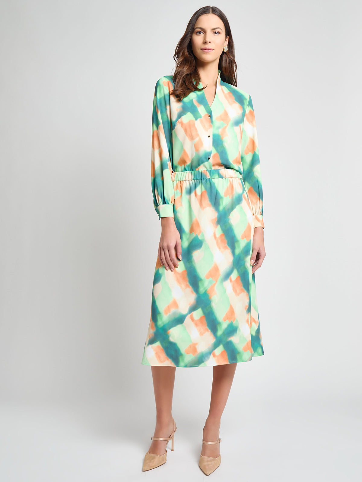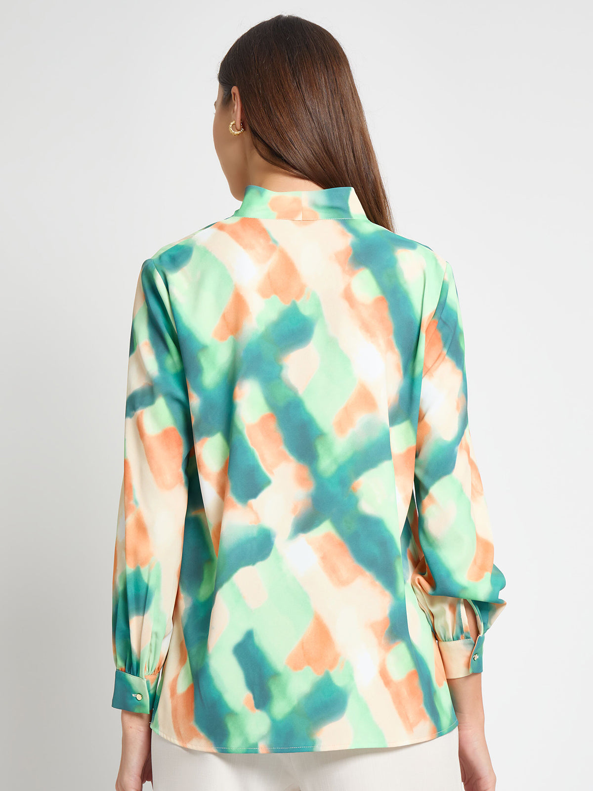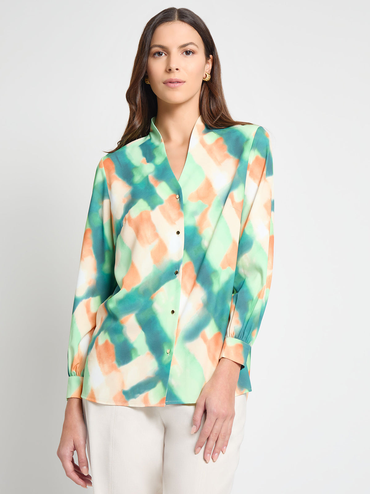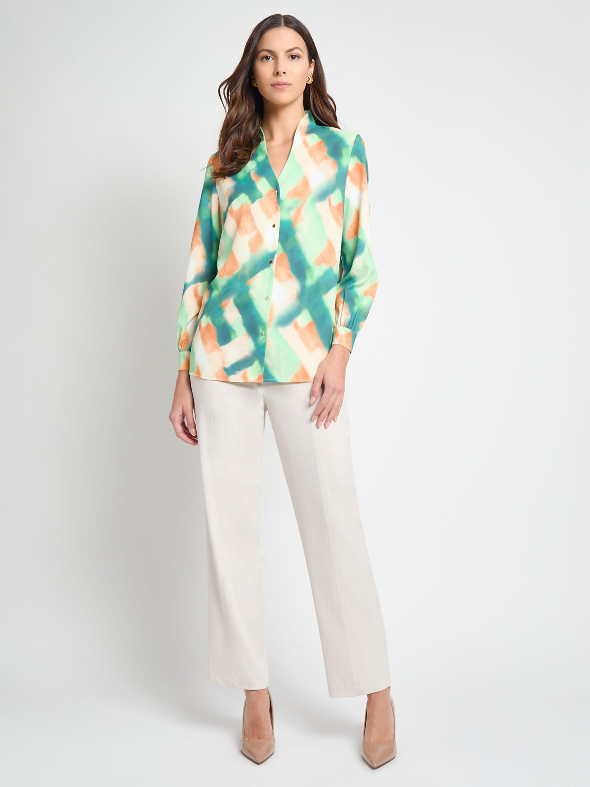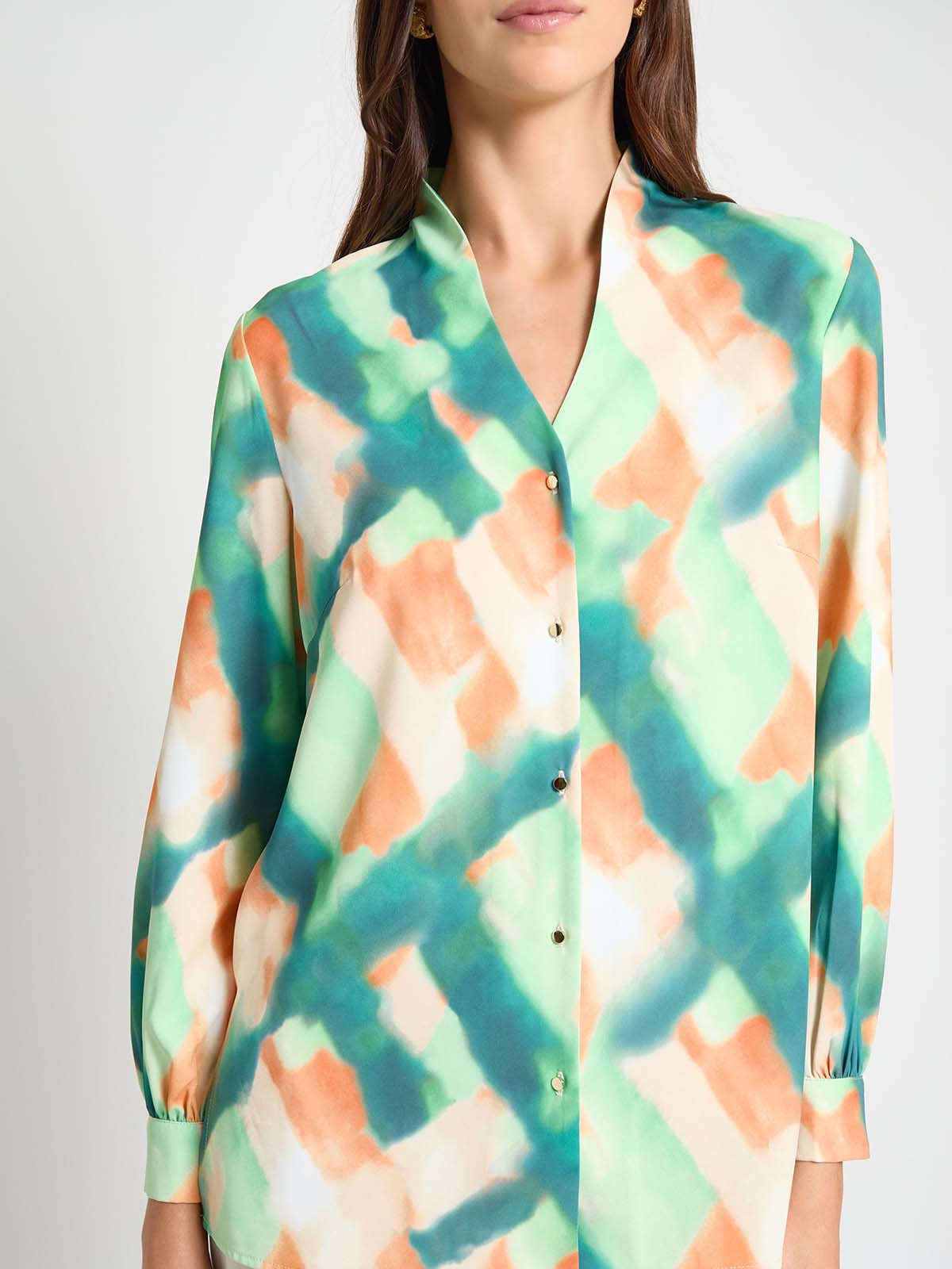 Our Abstract Blouse exudes sophistication with its exquisite printed design and refined details. The long sleeves feature elegant button cuffs, while the modified mandarin collar and button front closure ensure a flawless look. Perfectly paired with the matching skirt or styled with your own pieces, this blouse offers versatile elegance and timeless charm.