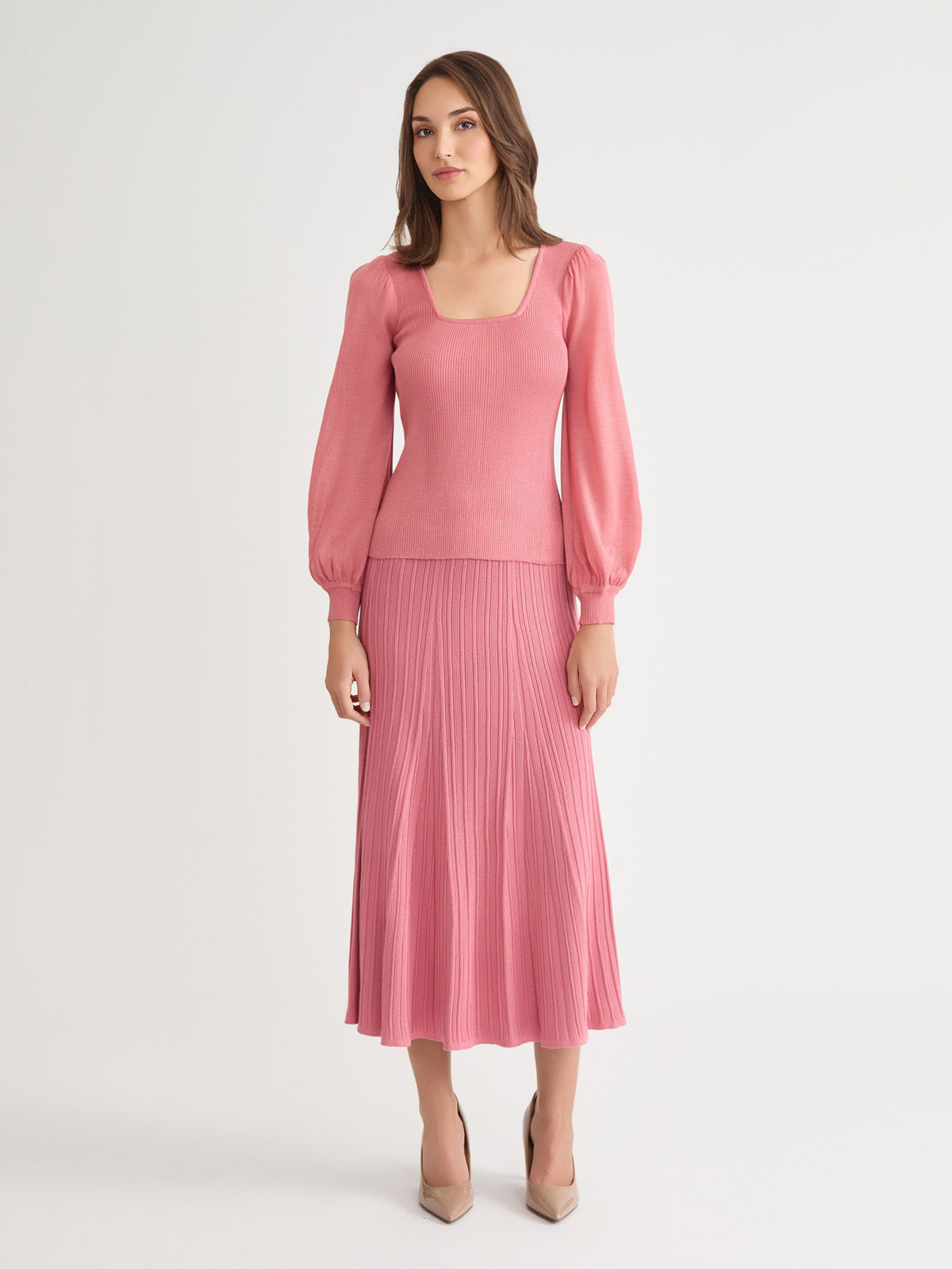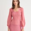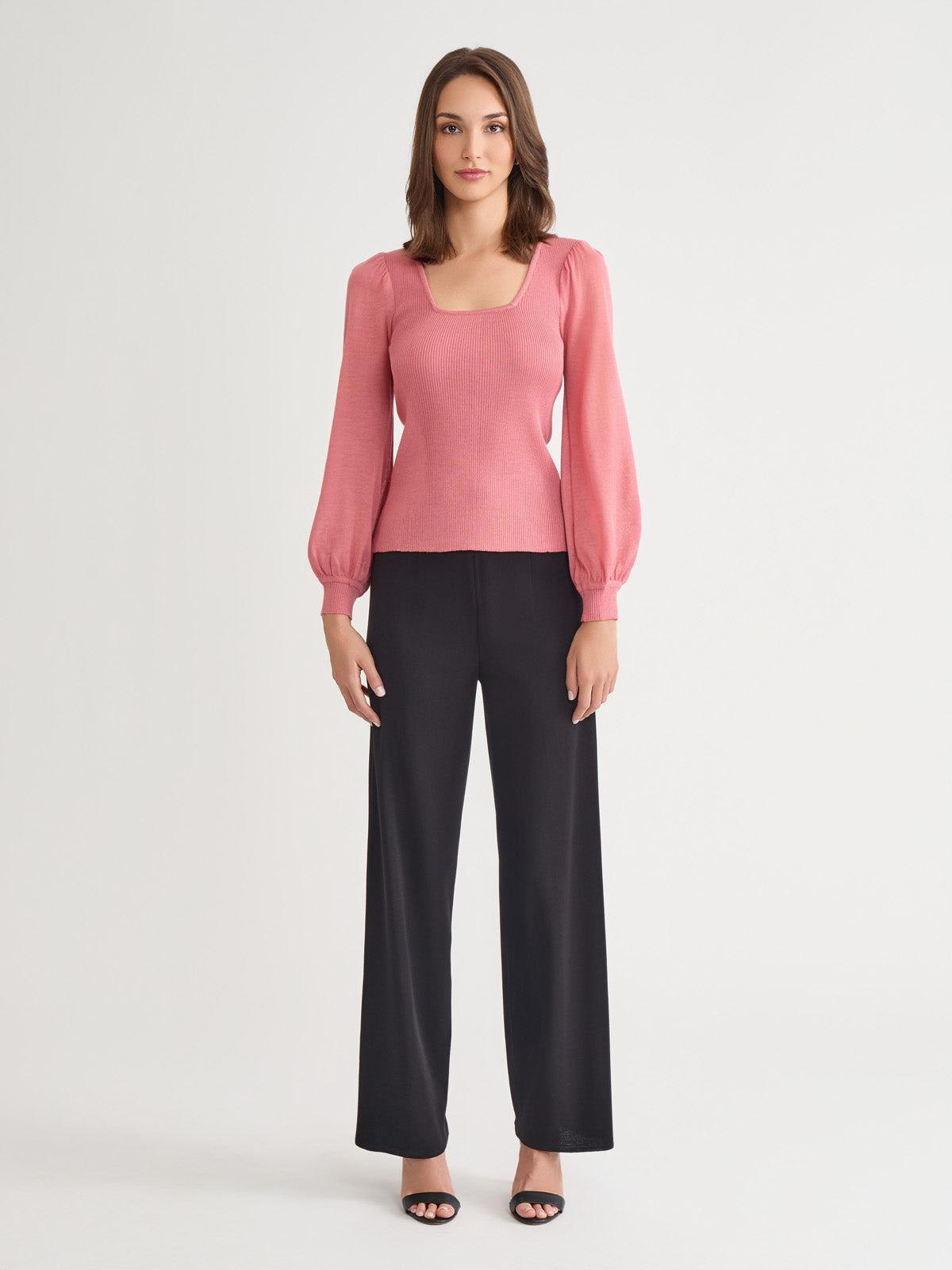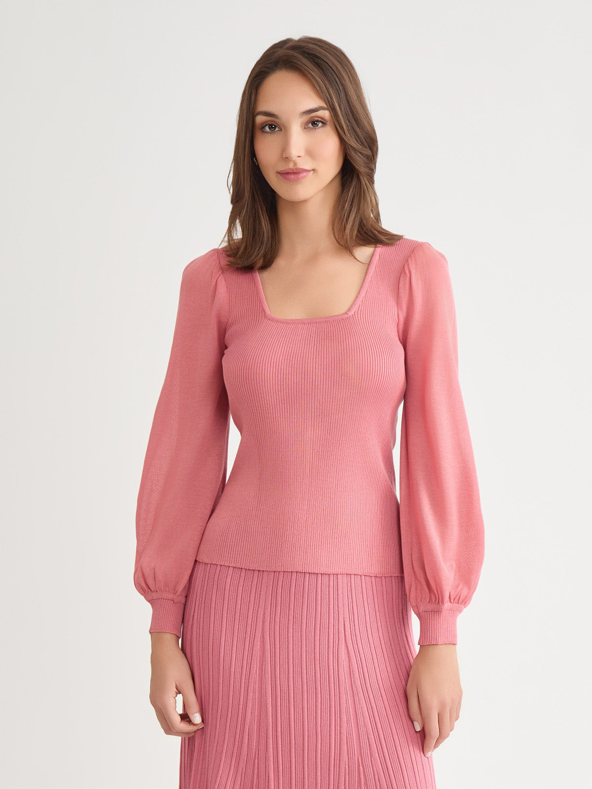Crafted from wrinkle-resistant knit fabric, this top features a classic square neckline and long sheer puff sleeves that add a touch of drama and elegance. Whether you’re dressing up for an evening out or pairing it with one of our knit skirts for a more casual look, this top offers both versatility and style.