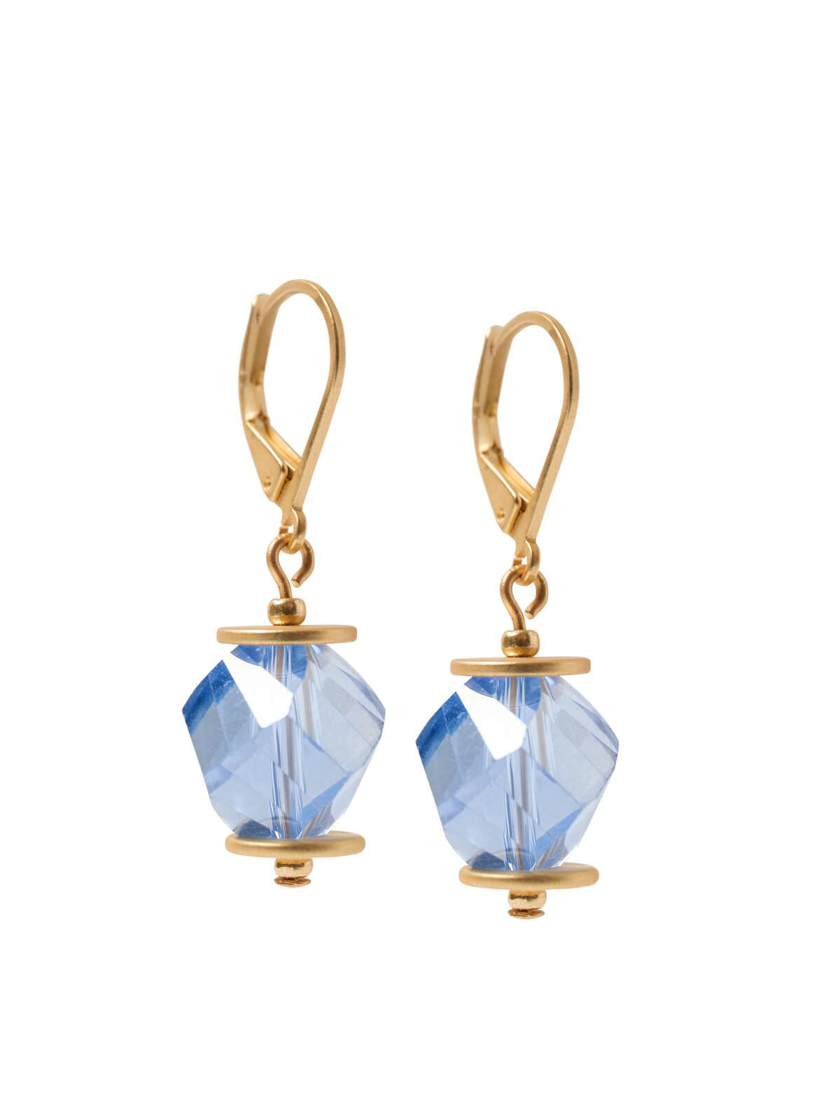 Our Blue Crystal Earrings feature saucer accents that encase the crystal, providing a simple yet stunning look. These earrings are plated in 18K Matte Gold. The Lever Back offers ease of wear. Pair these back with our Matte Amethyst Necklace for a cohesive look.
