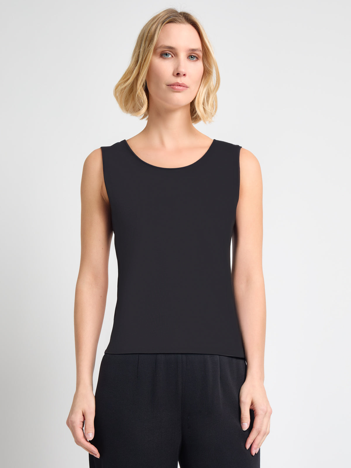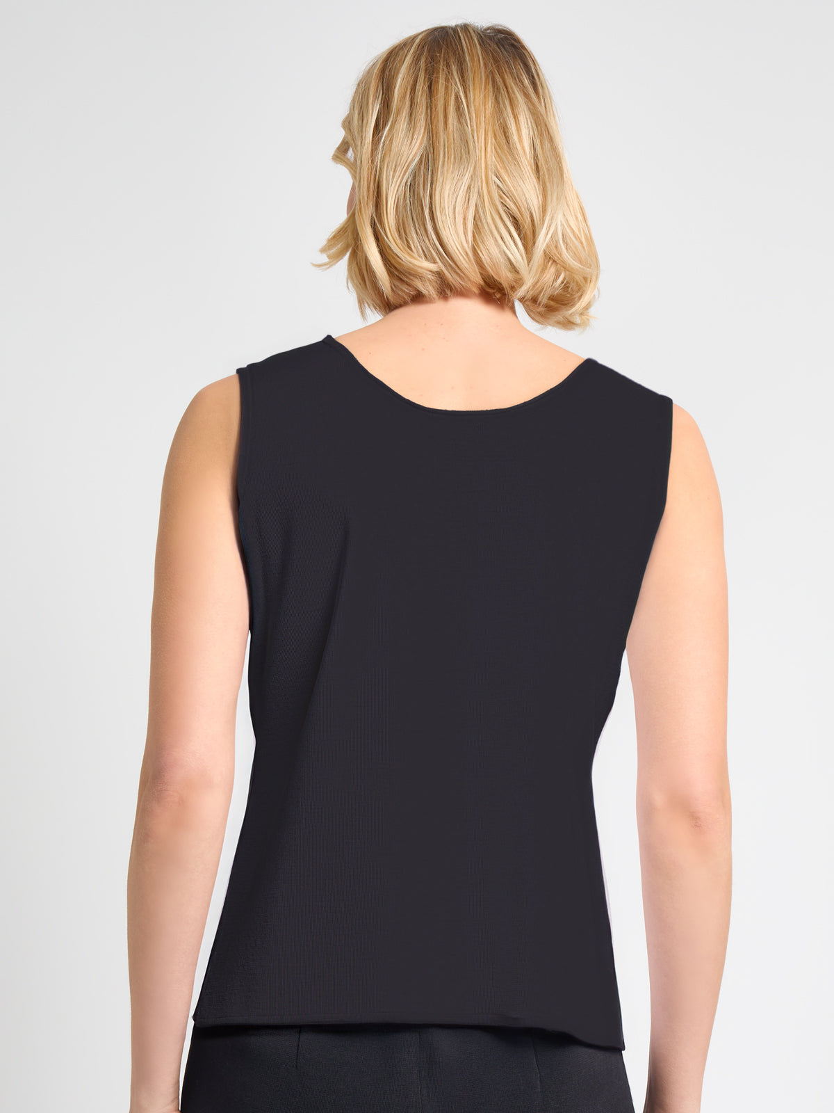 This 23″ pullover, double scoop-neck tank is a statement-worthy piece perfect for layering. Falling right at the hips, this tank is slimming for all sizes. This tank is crafted in our signature wrinkle-resistant knit, and it holds its shape throughout your busy day. Wear it on its own or layered under your favorite Misook jacket for a look that is as professional as it is polished.