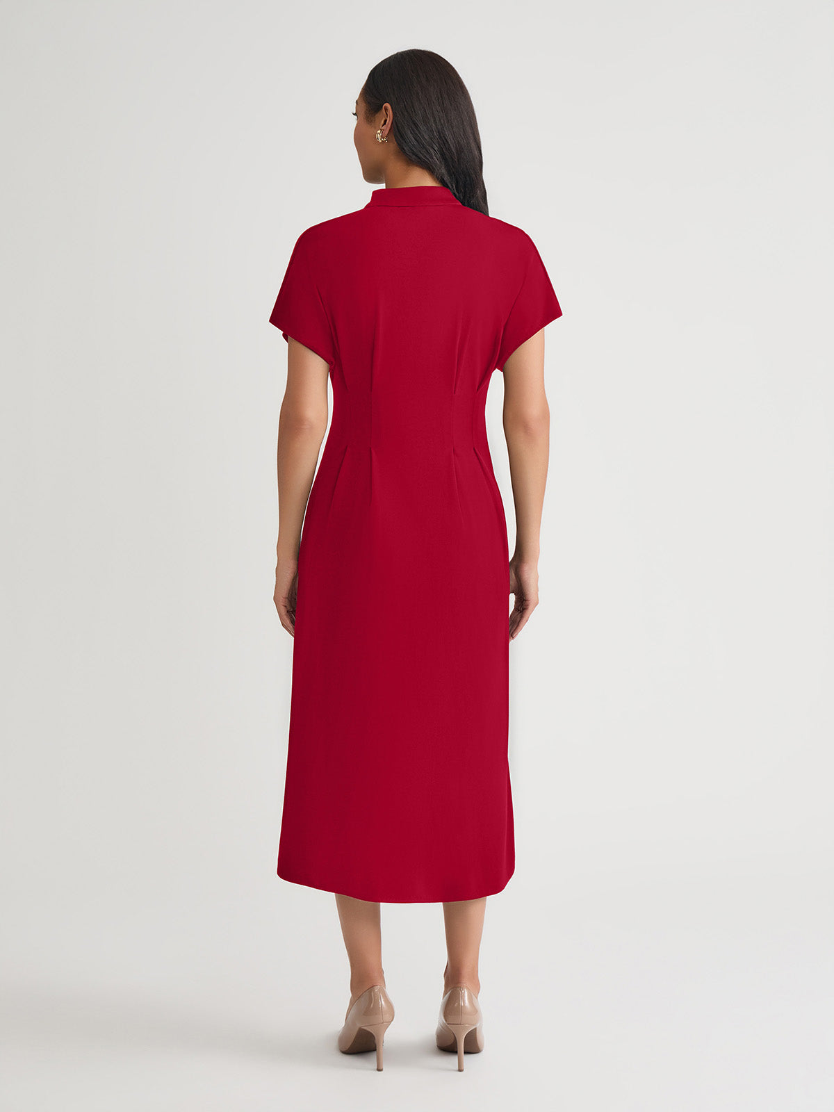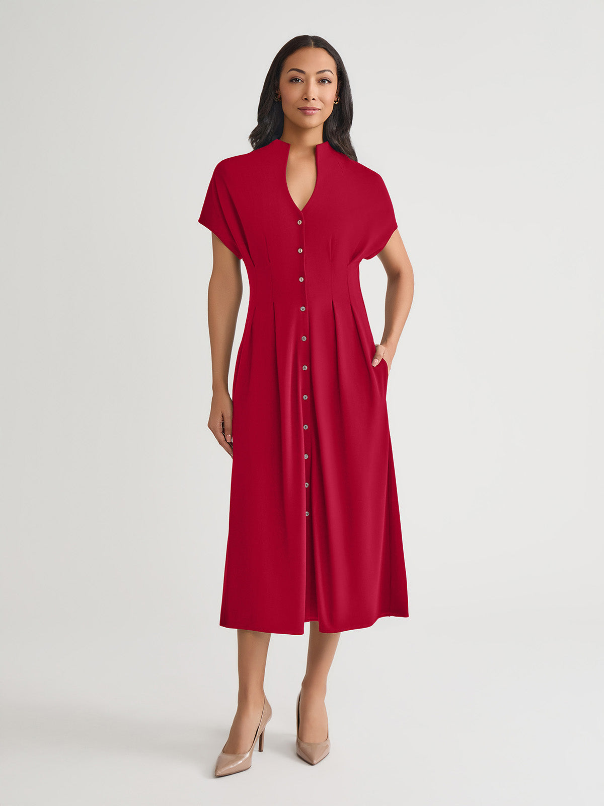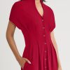 Breezy elegance meets tailored charm in this Fit & Flare Cotton Button-Up Maxi Dress. Crafted in soft, breathable cotton, it features an open stand neckline and gently flared silhouette that drapes beautifully with every step. Short sleeves and a full button-up front enhance its refined ease, while functional side pockets add a practical yet polished touch.