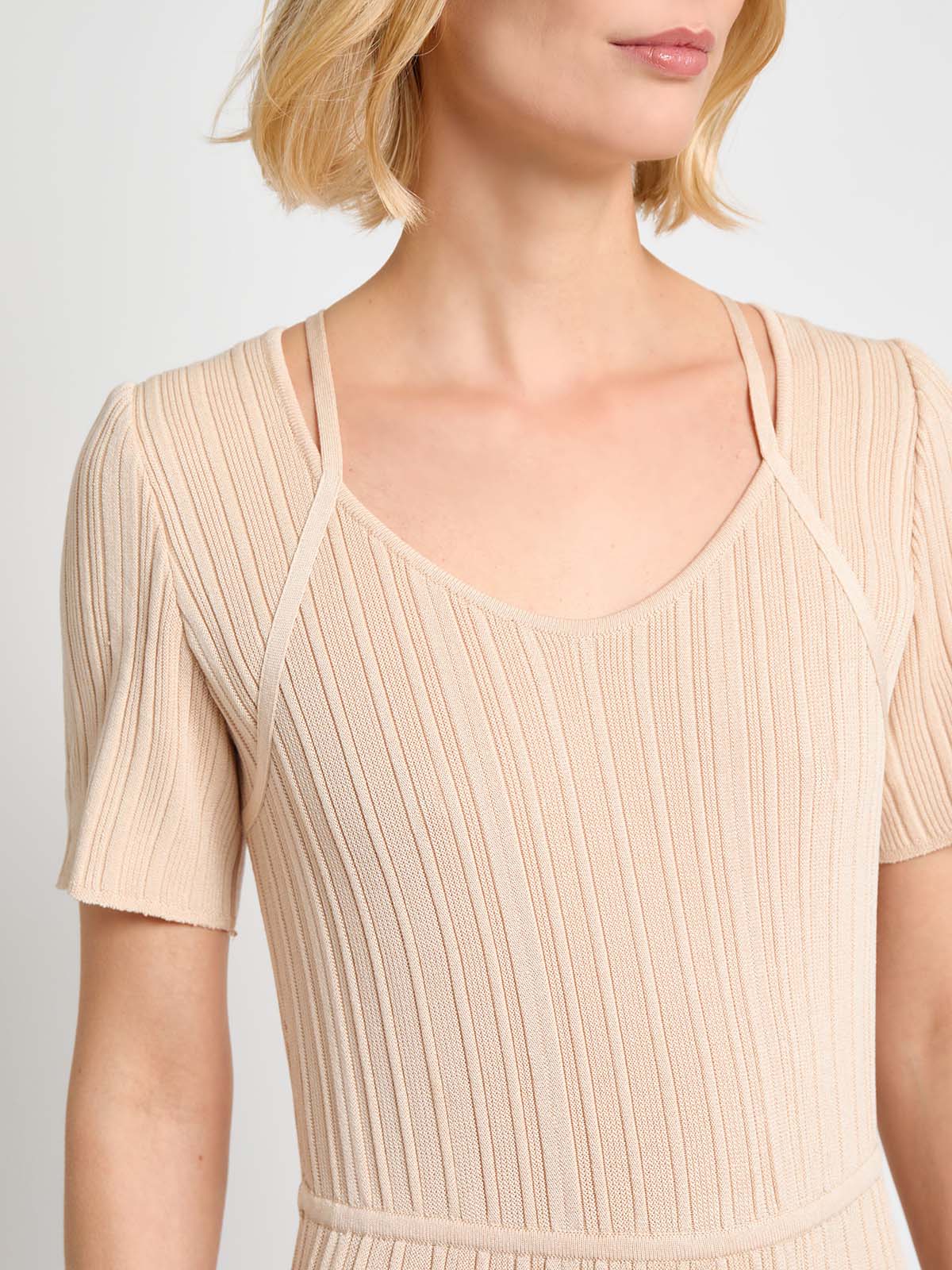 Discover the perfect blend of comfort and sophistication with the Fit & Flare Ribbed Soft Knit Maxi Dress. Designed with a wrinkle-resistant, soft ribbed knit fabric, this dress is perfect for busy days when you need both style and ease. The flattering fit-and-flare silhouette and soft V-neck make it ideal for a variety of occasions, while the unique shoulder strap detailing adds a modern touch to this timeless design.
