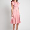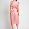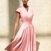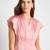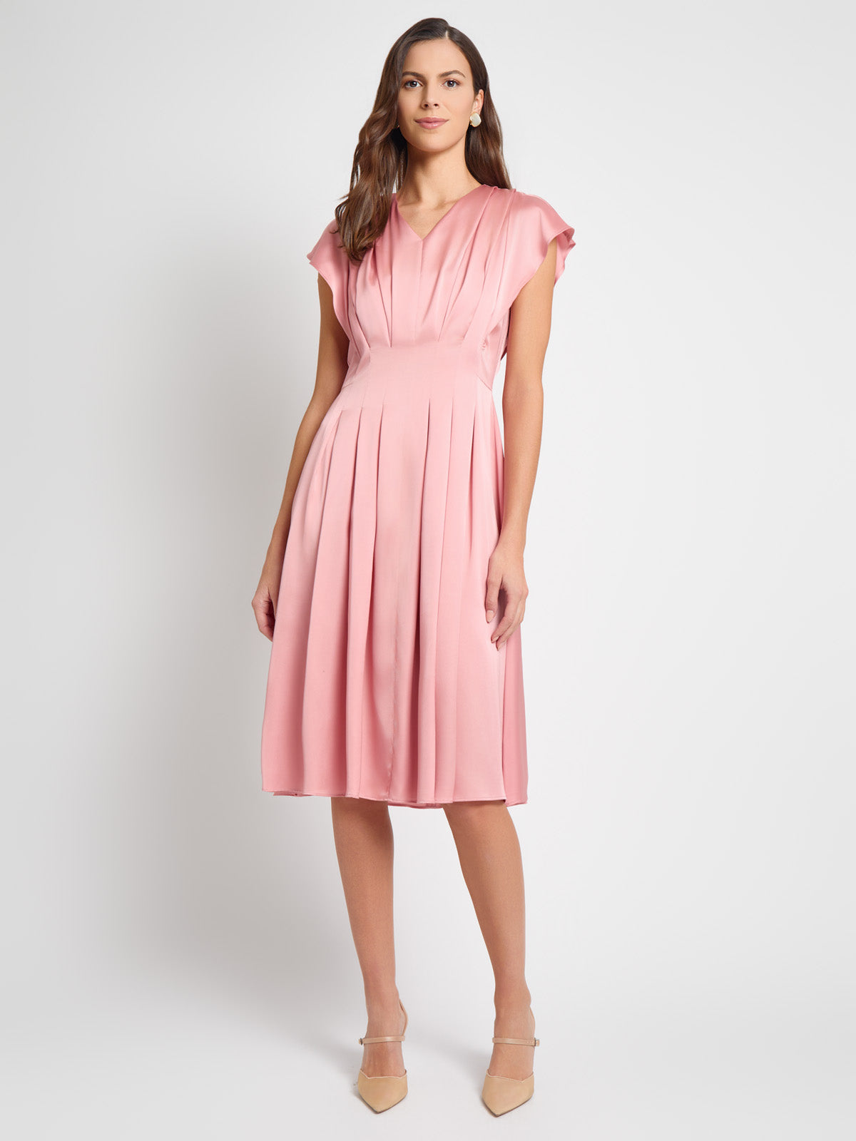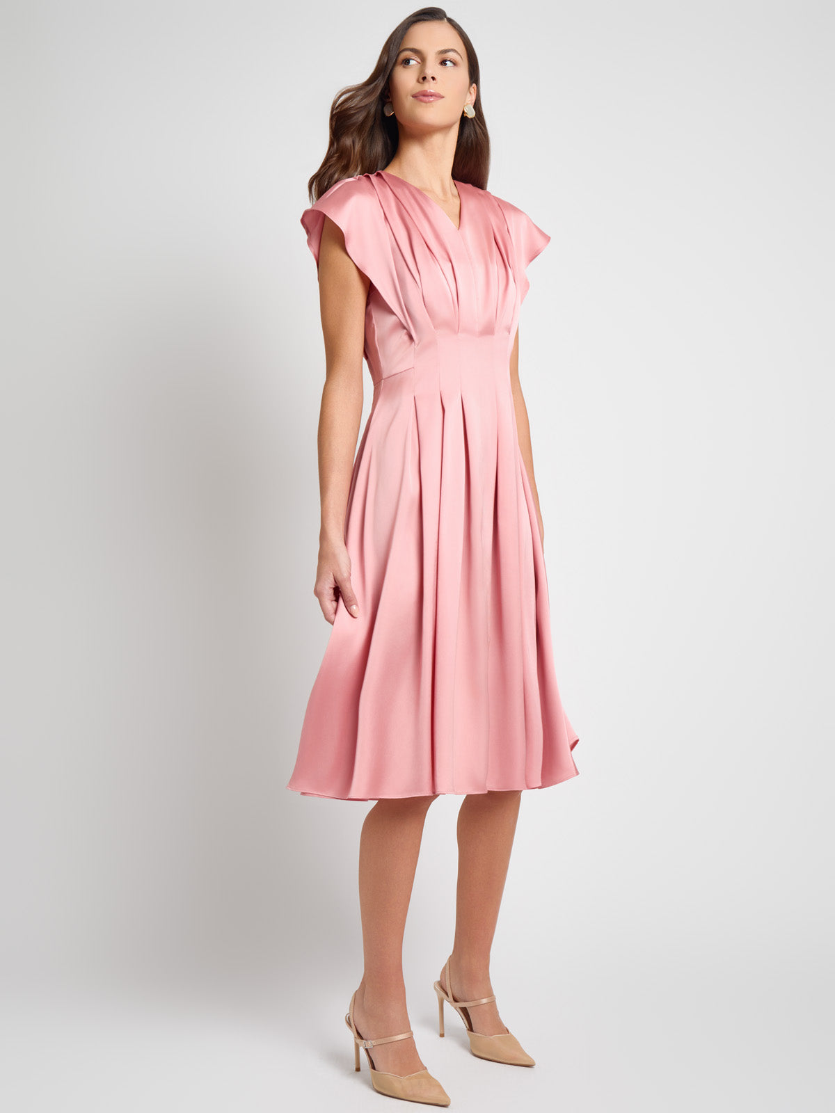 Step out in sophisticated style with the Fit & Flare Tuck Waist Midi Dress. Crafted from luxurious crepe de chine, this dress offers a smooth, polished look with a flattering fit and flare silhouette. Featuring a V-neckline, flutter cap sleeves, and a back zipper closure, this midi dress is perfect for formal occasions and evening events. The tuck waist detailing adds structure and shape, creating a stunning, feminine profile.