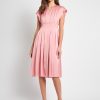 Step out in sophisticated style with the Fit & Flare Tuck Waist Midi Dress. Crafted from luxurious crepe de chine, this dress offers a smooth, polished look with a flattering fit and flare silhouette. Featuring a V-neckline, flutter cap sleeves, and a back zipper closure, this midi dress is perfect for formal occasions and evening events. The tuck waist detailing adds structure and shape, creating a stunning, feminine profile.