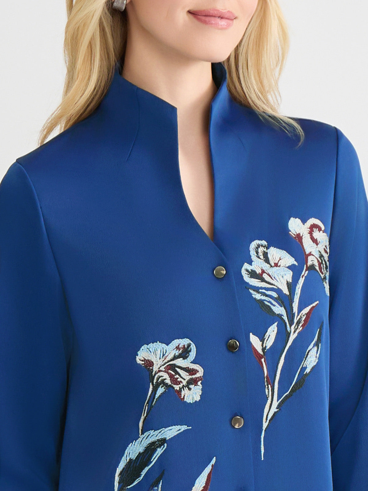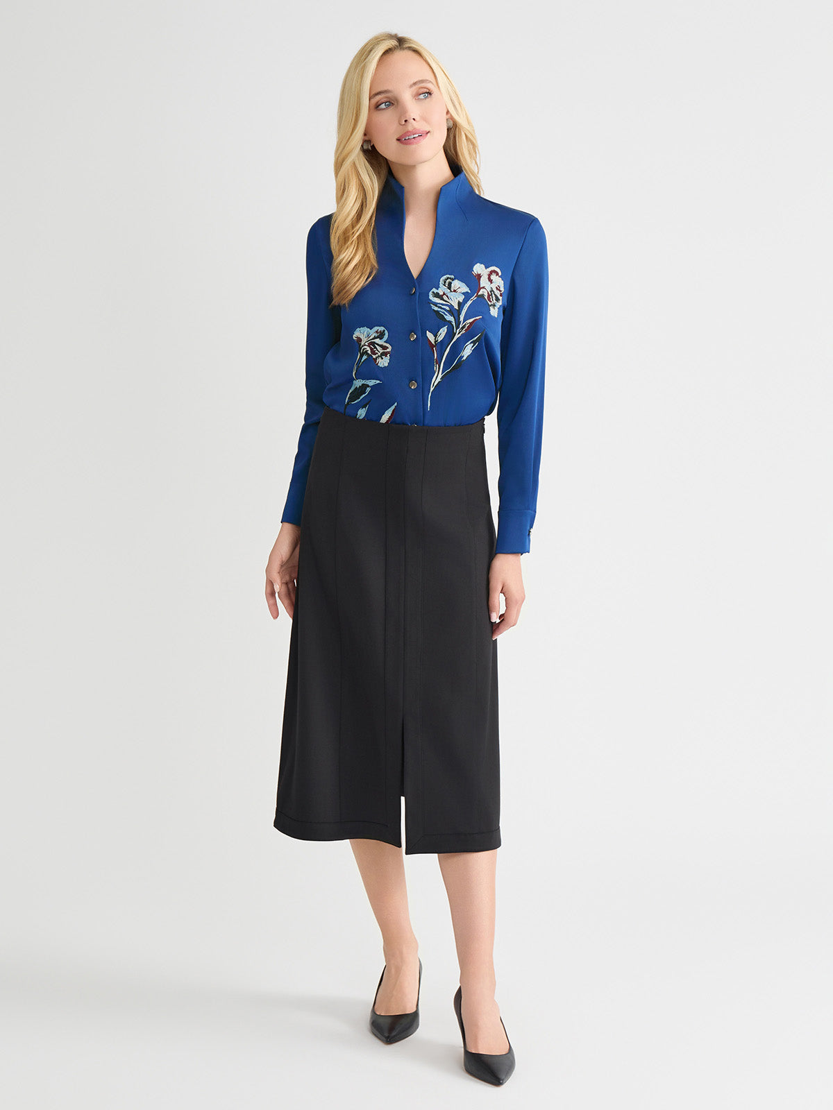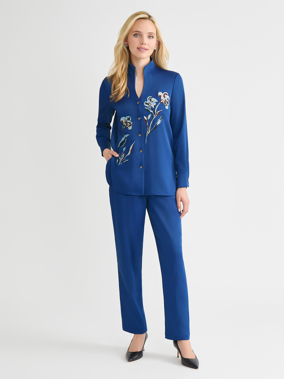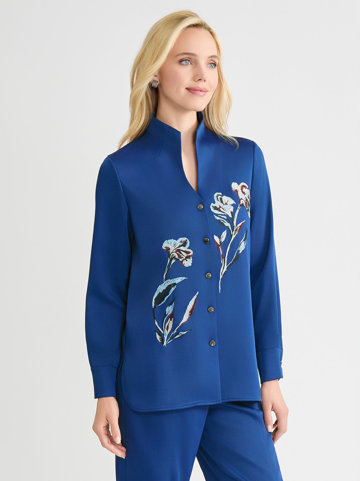 Gracefully tailored for refined occasions, this Embroidered Crepe de Chine Blouse is the epitome of modern sophistication. Crafted from fluid crepe de chine, the blouse drapes beautifully at a 27-inch length, offering an effortlessly elegant silhouette that transitions seamlessly from evening soirées to upscale gatherings. The intricate embroidery elevates the blouse, creating a statement piece that feels both timeless and trend-forward.