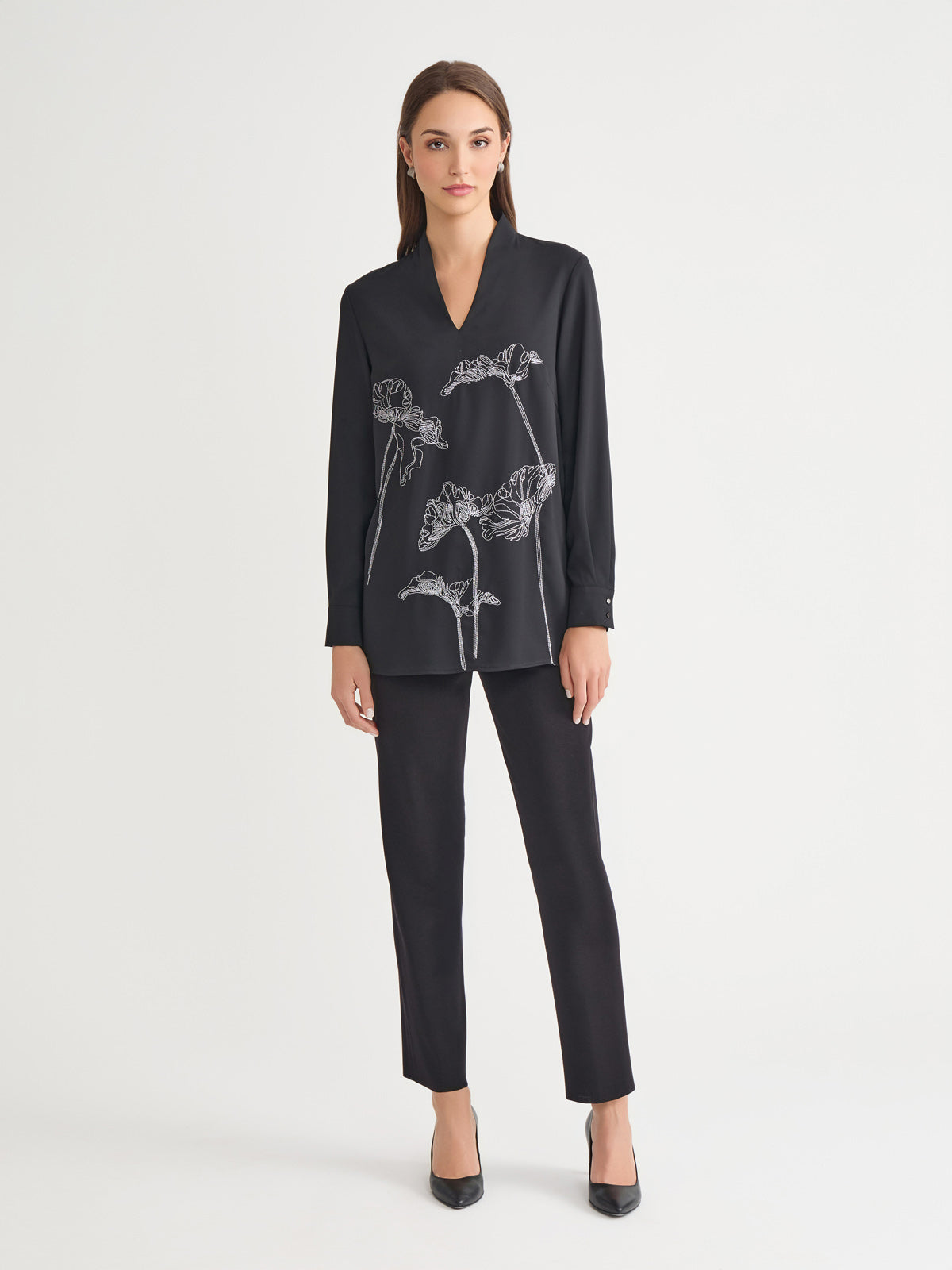 Perfect for office wear, casual outings, or evening events, the Floral Embroidered Crepe de Chine Tunic is a versatile and elegant piece that transitions seamlessly from day to night. Its feminine floral details, flattering fit, and luxurious fabric make it a must-have addition to any wardrobe. Pair this feminine tunic with a pair of seasonless Ponte pants or our best selling knit pants!