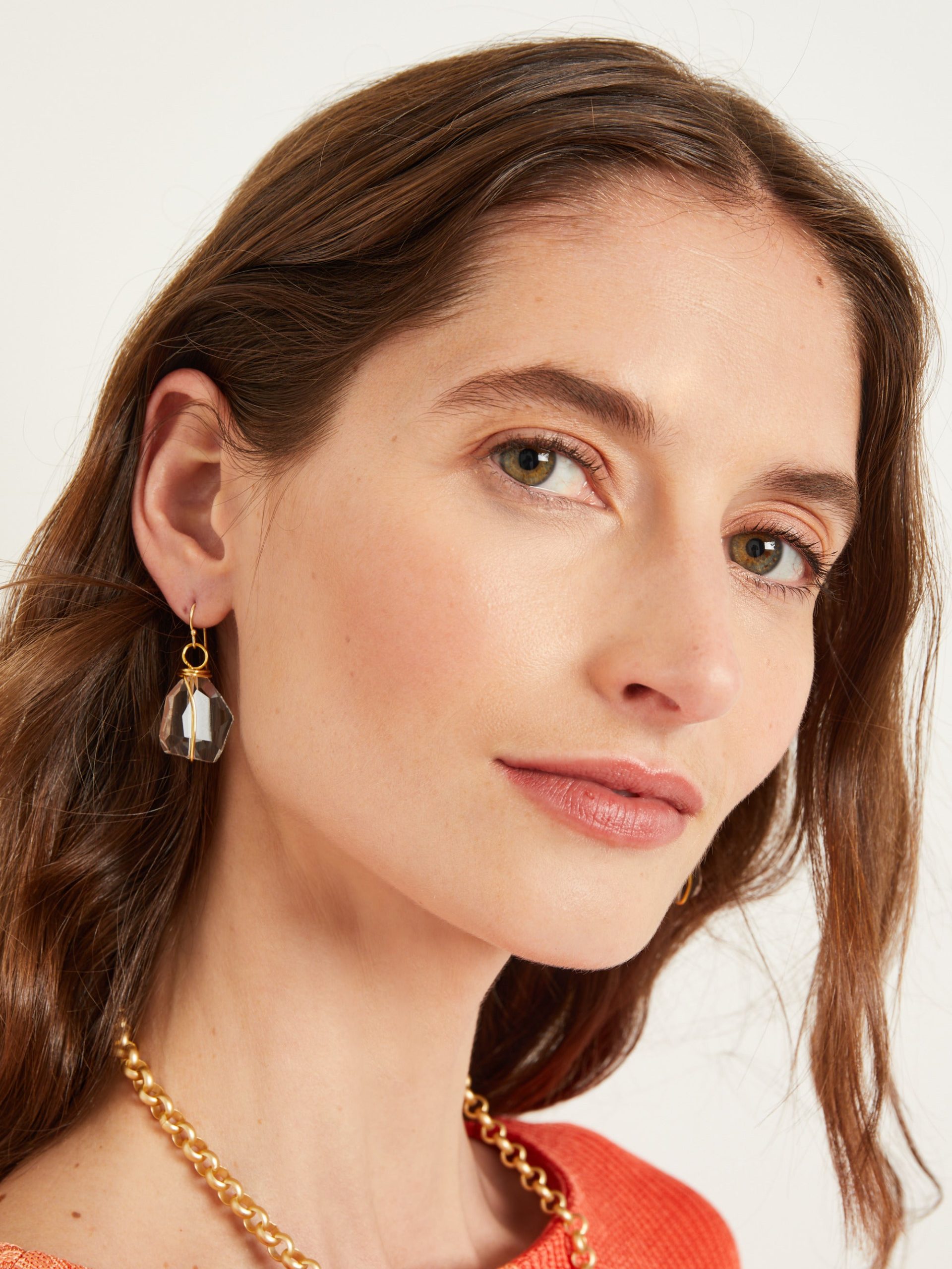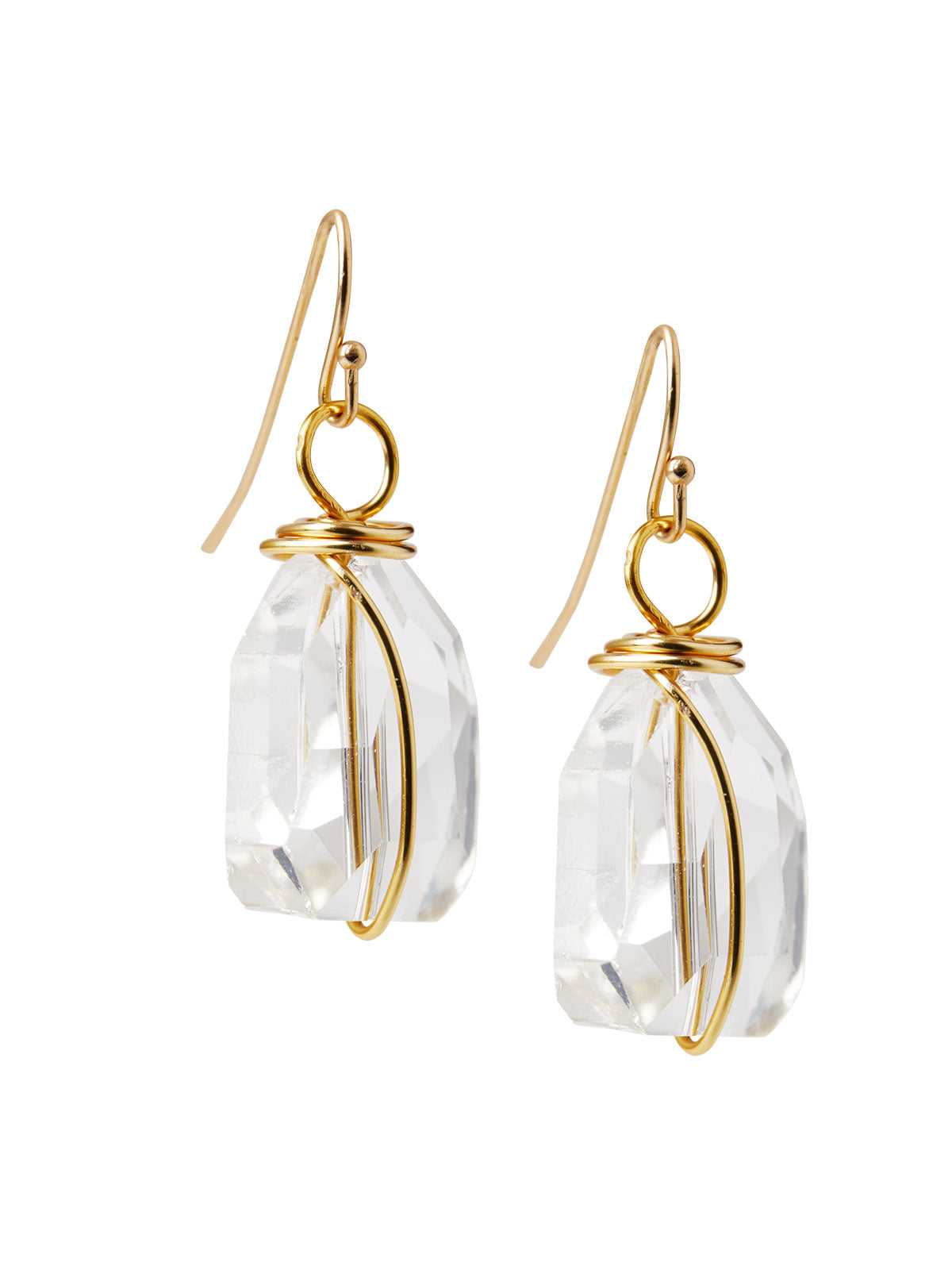 Crafted for timeless wear, our Handmade Crystal Nugget Wire Wrapped Earring is a collection mainstay for any formal attire. Its minimal design features a petite, faceted crystal delicately hand wrapped with a matte golden wire. Add it as the finishing touch to a chic ensemble requiring a soft, glimmering touch.