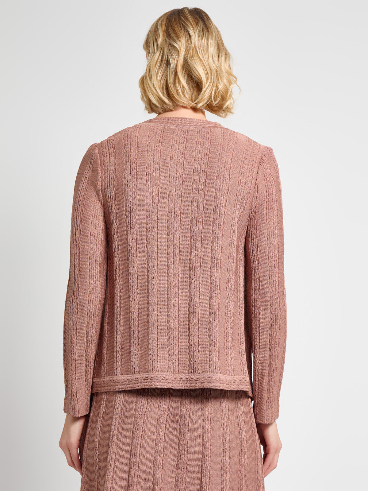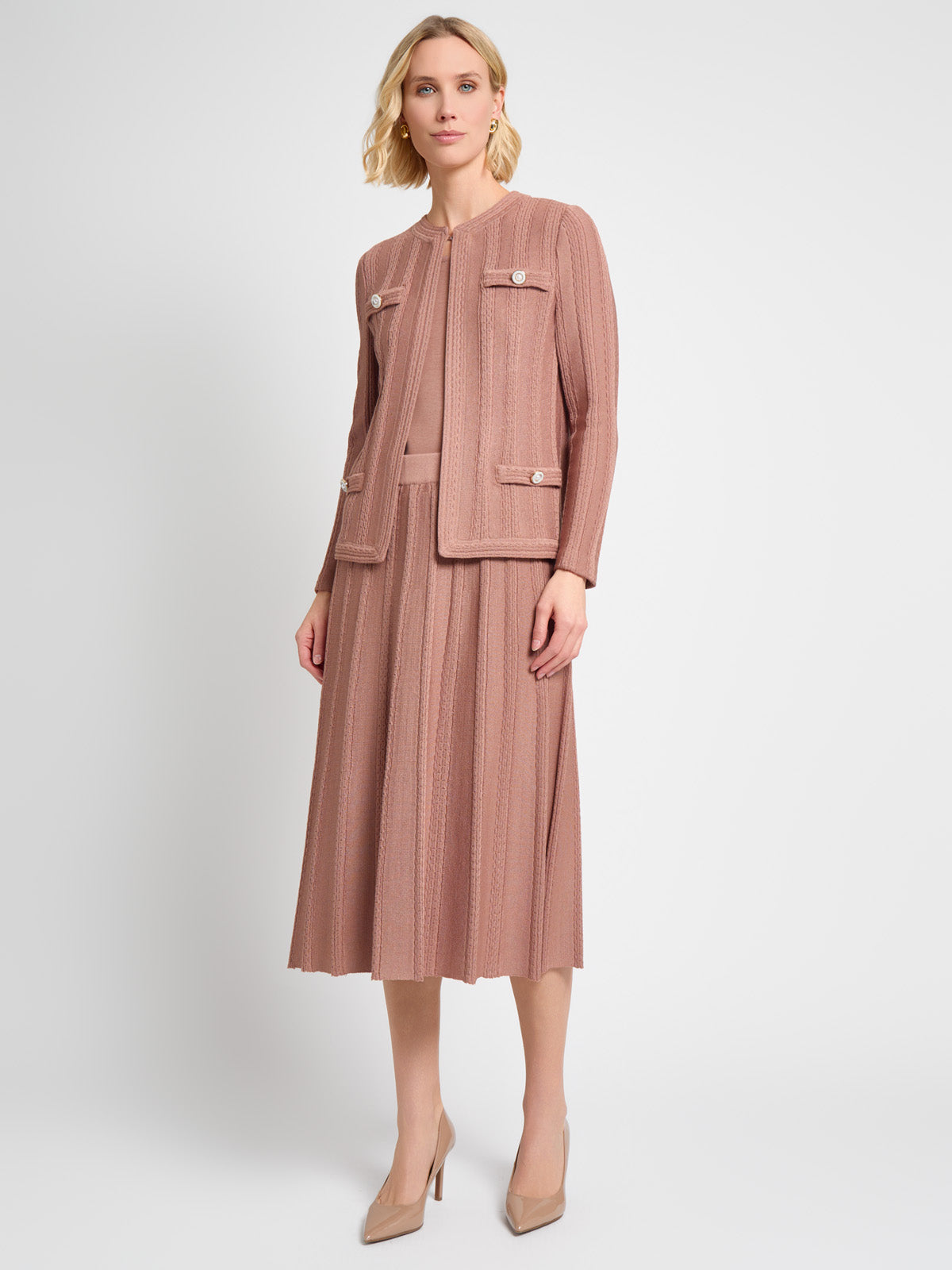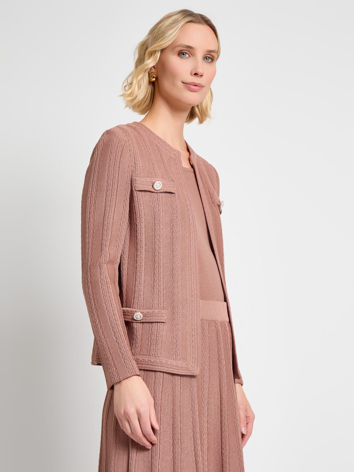 Ideal for both professional and casual settings, the Heritage Braided Cable Soft Knit Jacket adds a touch of elegance to any outfit, offering both style and comfort in one beautiful piece. The jewel neck, hook-and-eye closure, and faux pockets with pearl button accents elevate its style, making it a versatile piece for any wardrobe.
