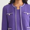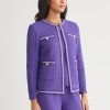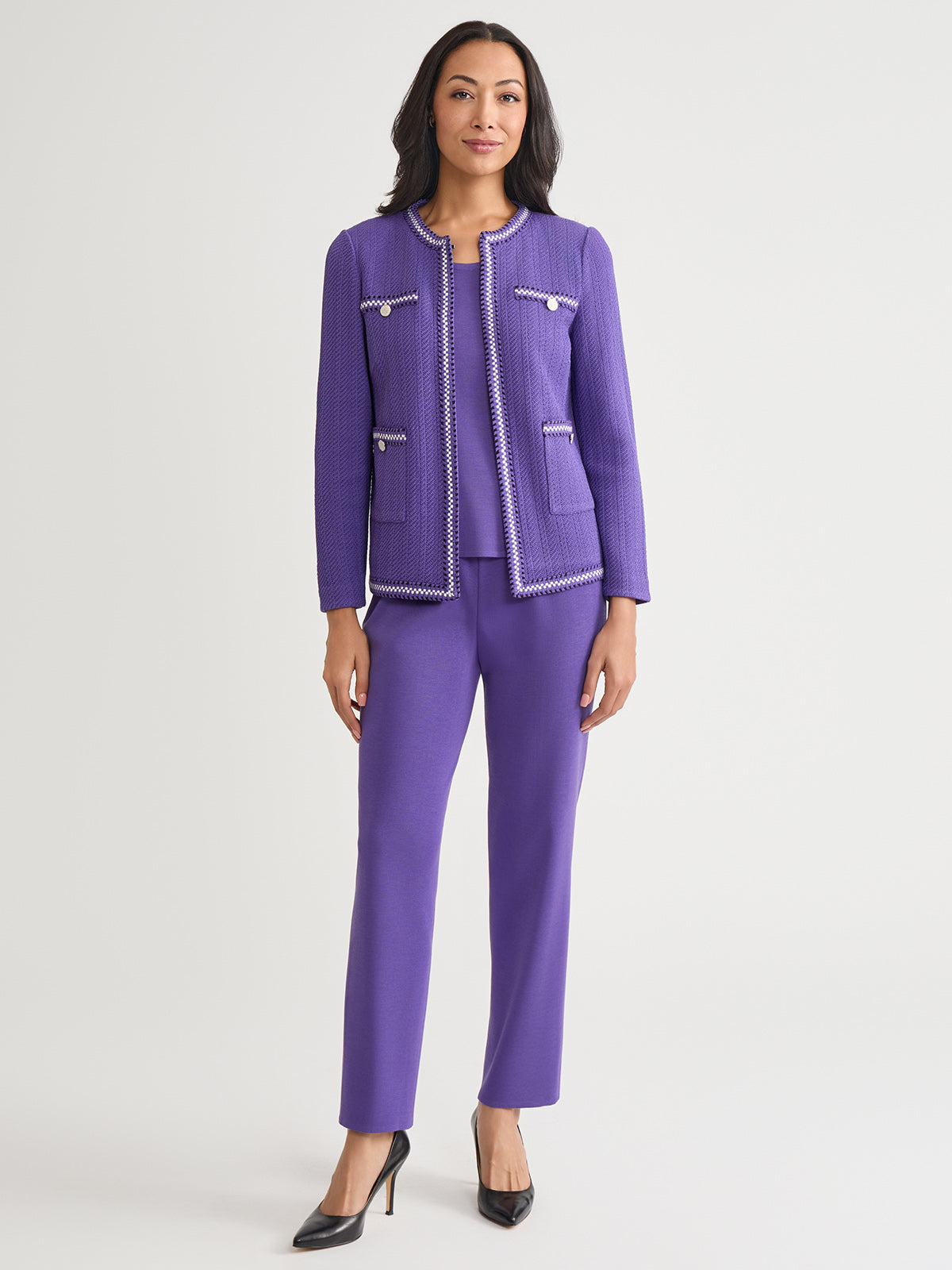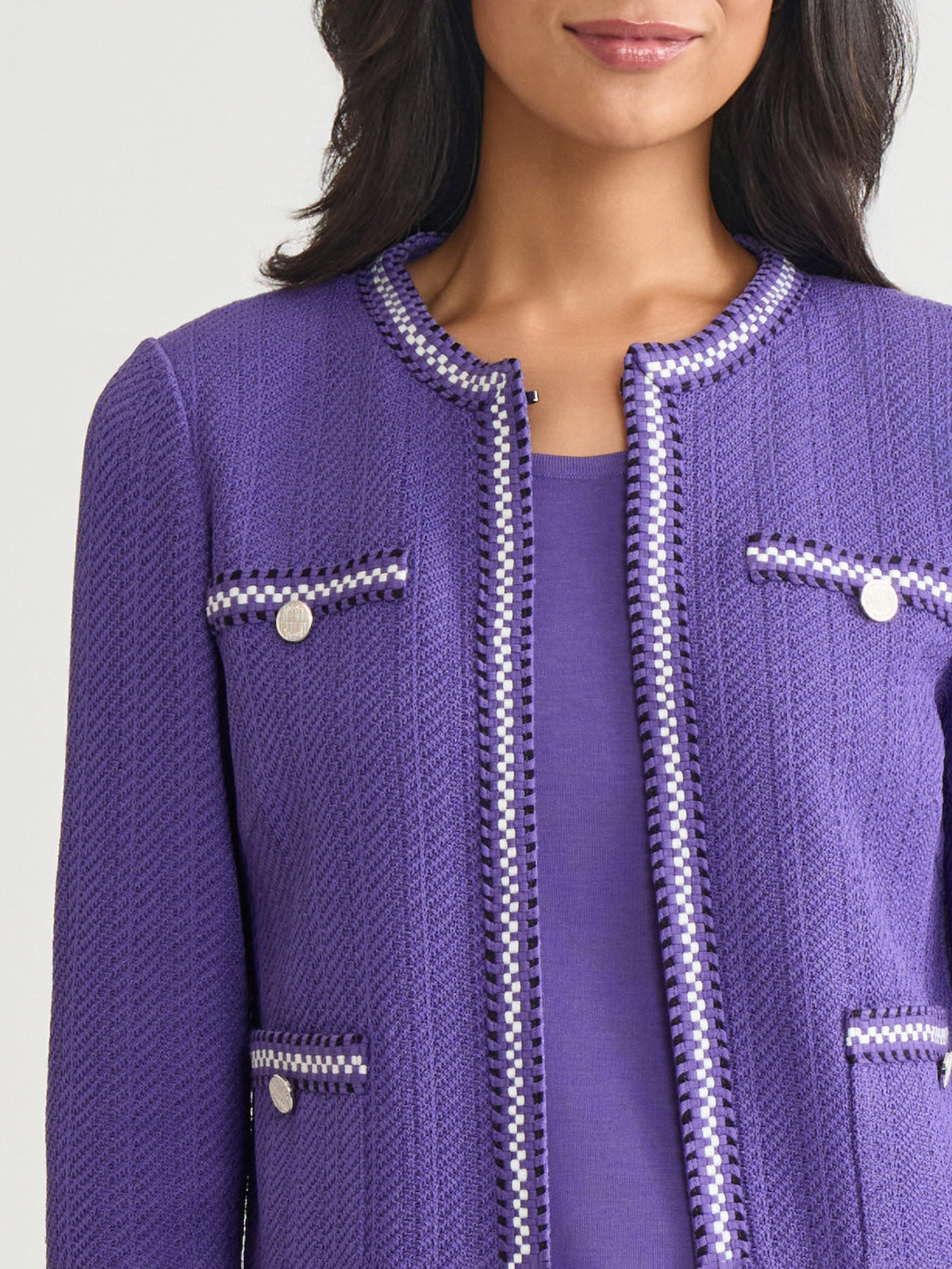 Elevate your workwear wardrobe with the Checkered Trim Knit Jacket, a versatile and sophisticated piece designed for the modern professional. With its sleek 23-inch length and flattering jewel neck, this jacket offers a polished look that seamlessly transitions from the office to after-hours events. Perfect for layering over blouses, dresses, or even casual attire, this knit jacket is an essential addition to any business casual or formal wardrobe.