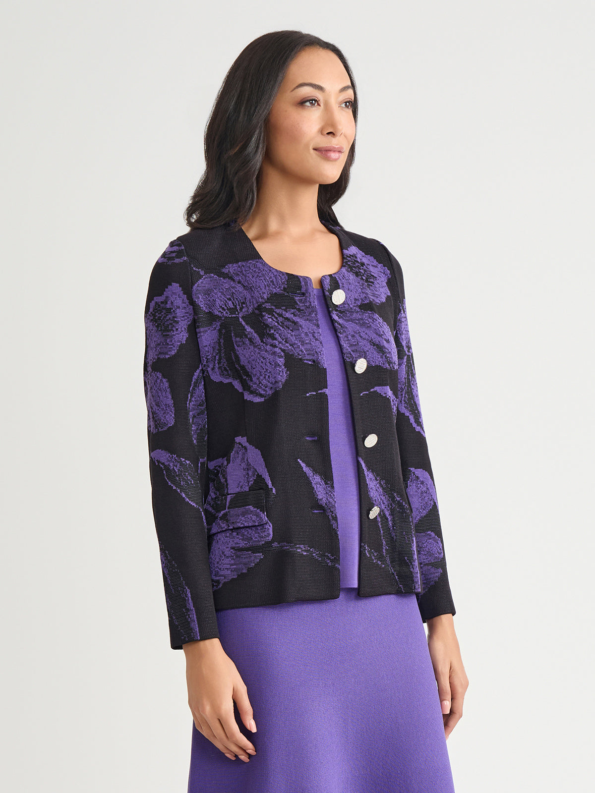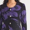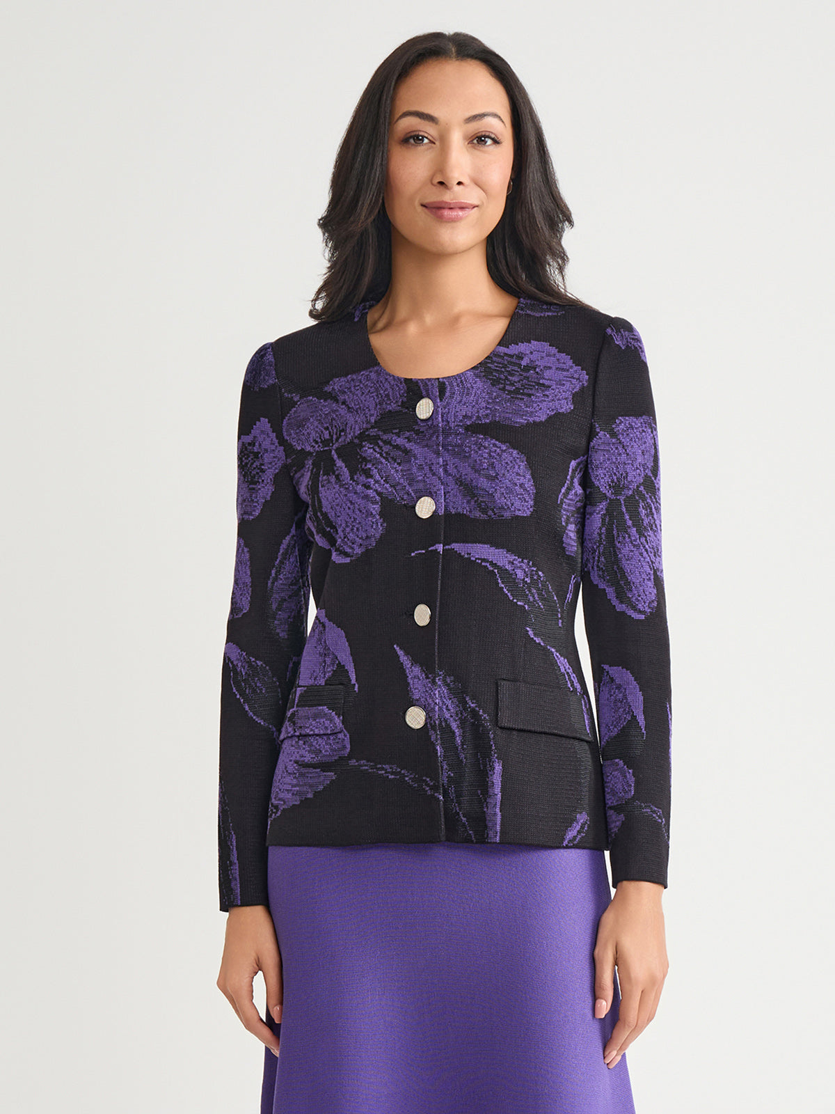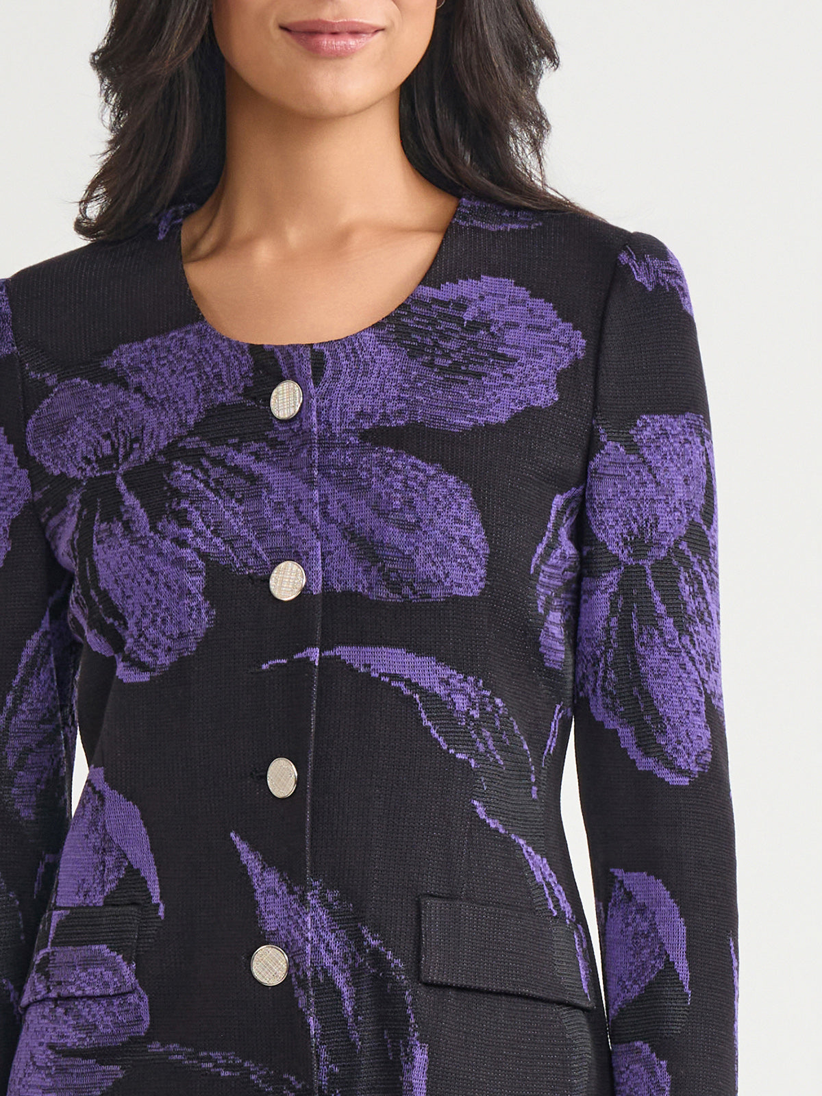 Elegance comes easy to this stunning jacket — intricately knit with a pattern of large, photorealistic florals in a striking purple and black hue. A sculpted, feminine is accented with a classic scoop neckline and fastened with gold-toned buttons for an added touch of sophistication.