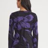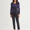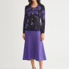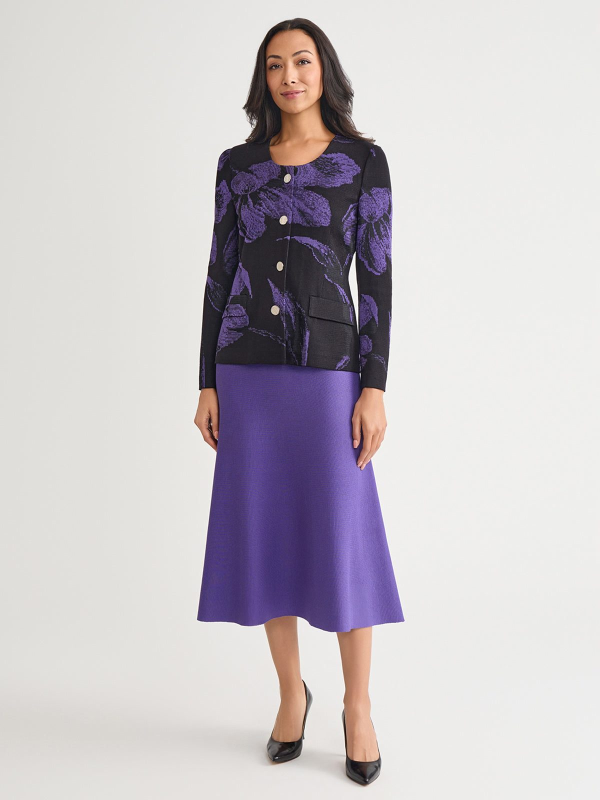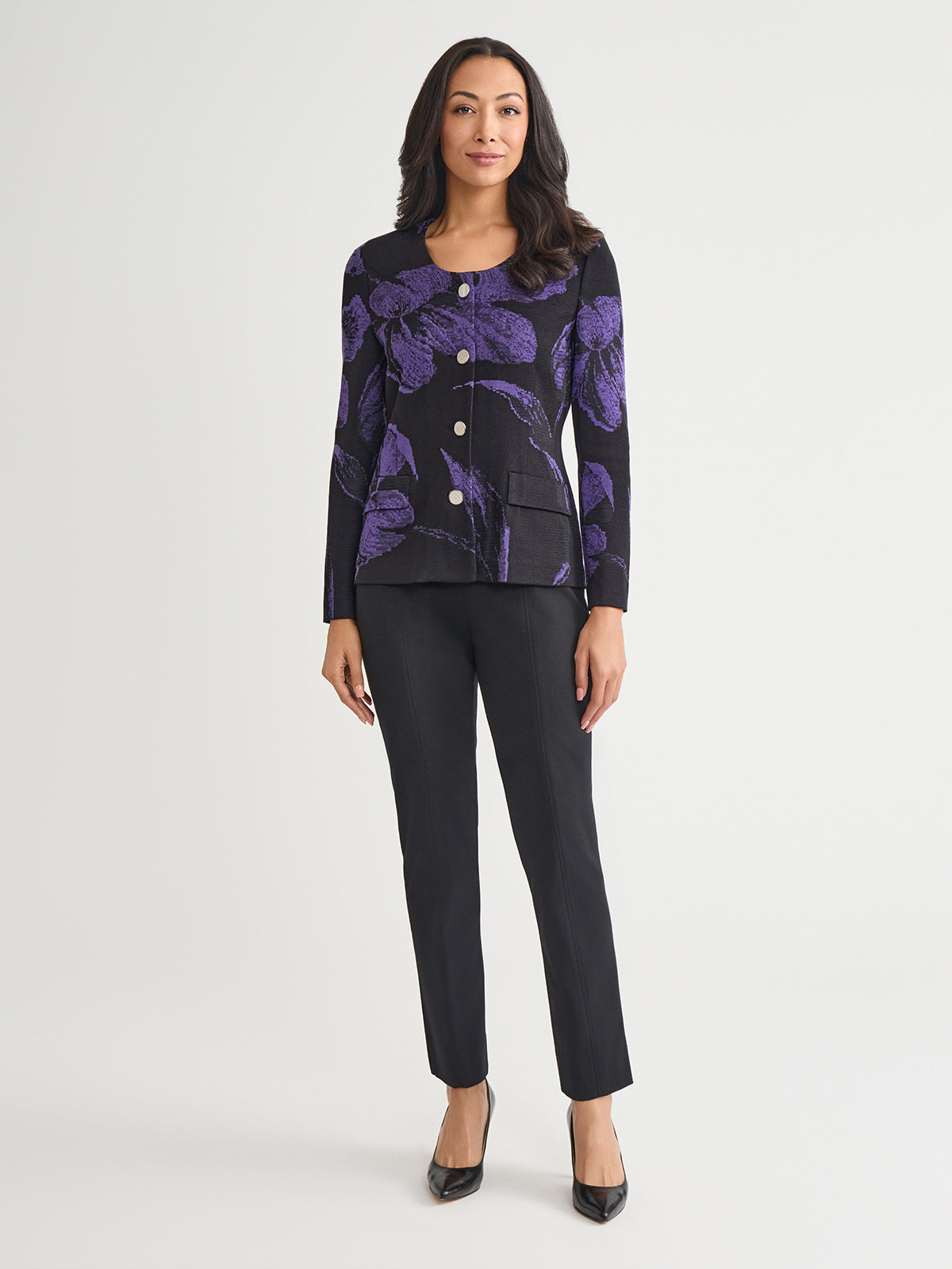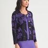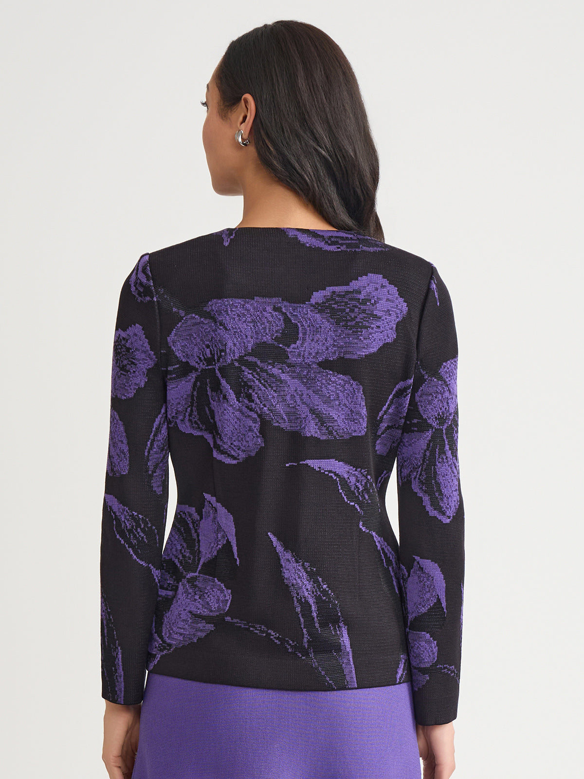 Elegance comes easy to this stunning jacket — intricately knit with a pattern of large, photorealistic florals in a striking purple and black hue. A sculpted, feminine is accented with a classic scoop neckline and fastened with gold-toned buttons for an added touch of sophistication.