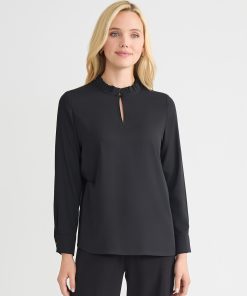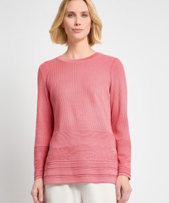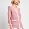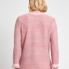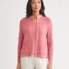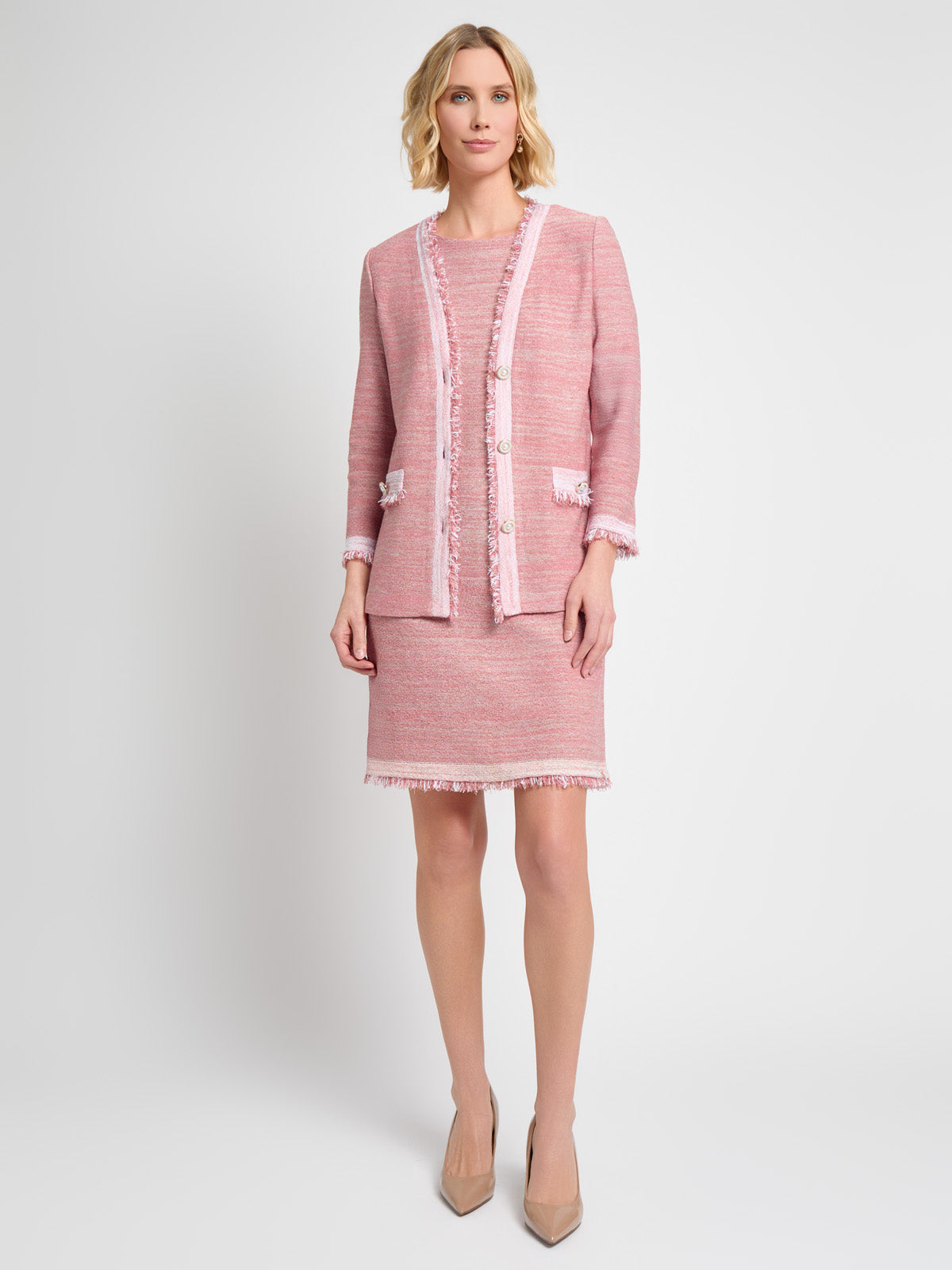 This wrinkle-resistant melange knit jacket combines timeless design with modern detailing. Featuring a flattering heritage silhouette, soft shoulder pads, and a front pearl button closure, this jacket adds a sophisticated touch to any outfit. The fringe trim and faux pocket details enhance its unique, chic look, while the bracelet-length sleeves add a stylish finish.