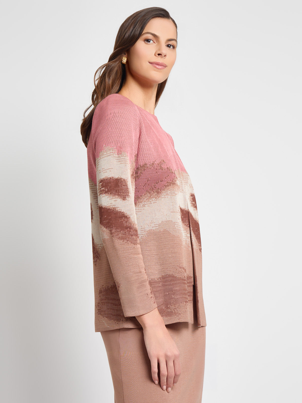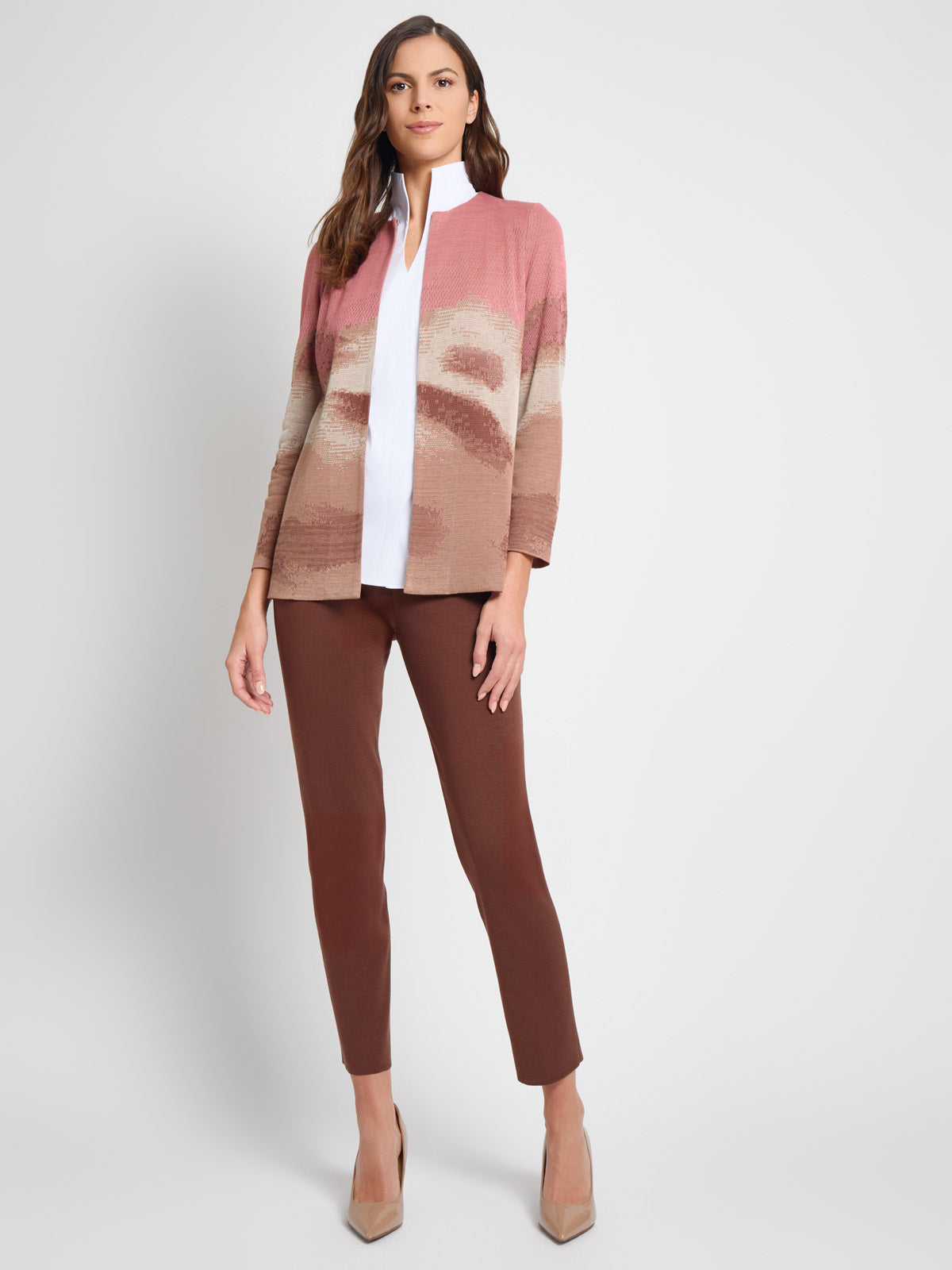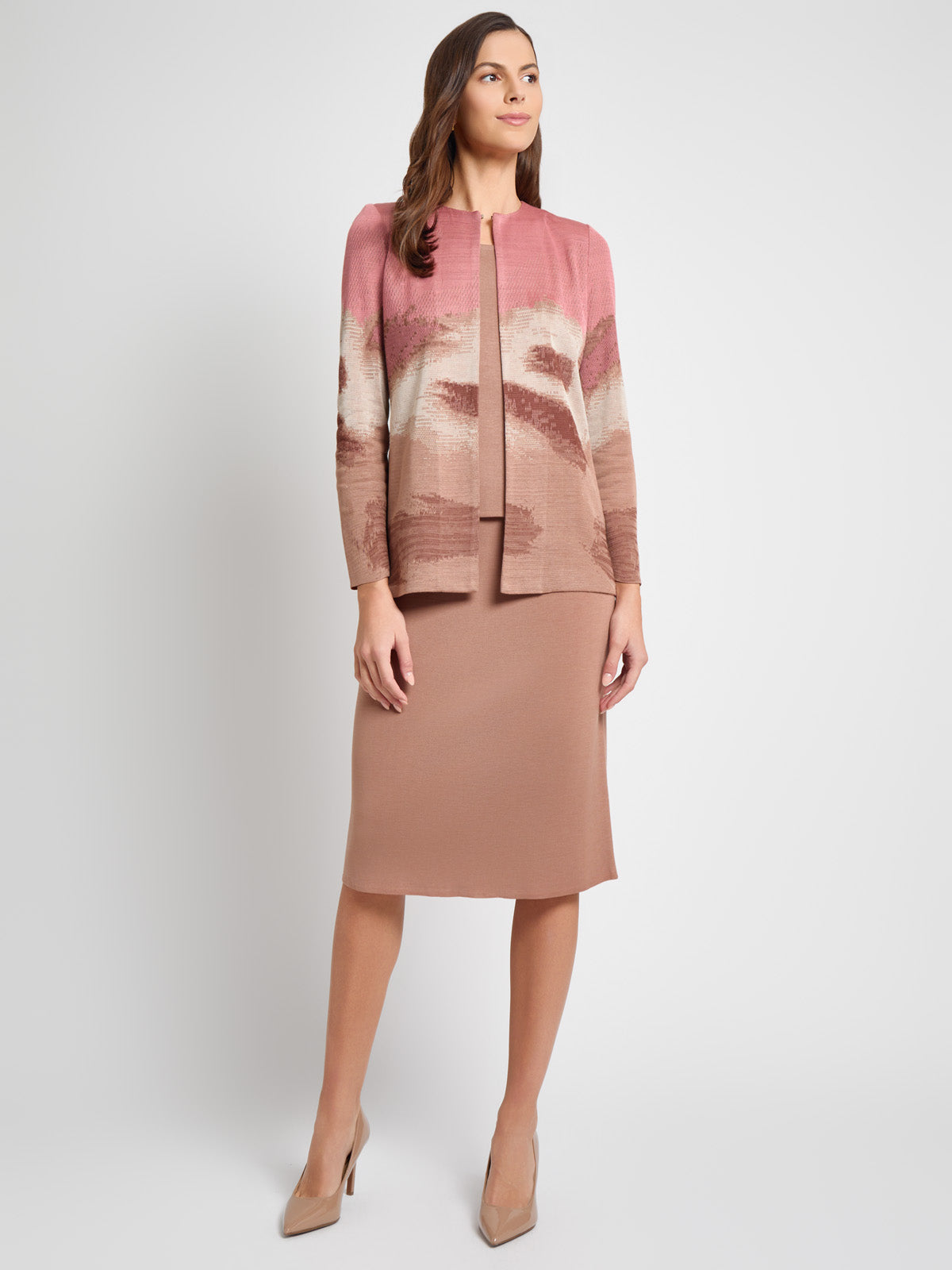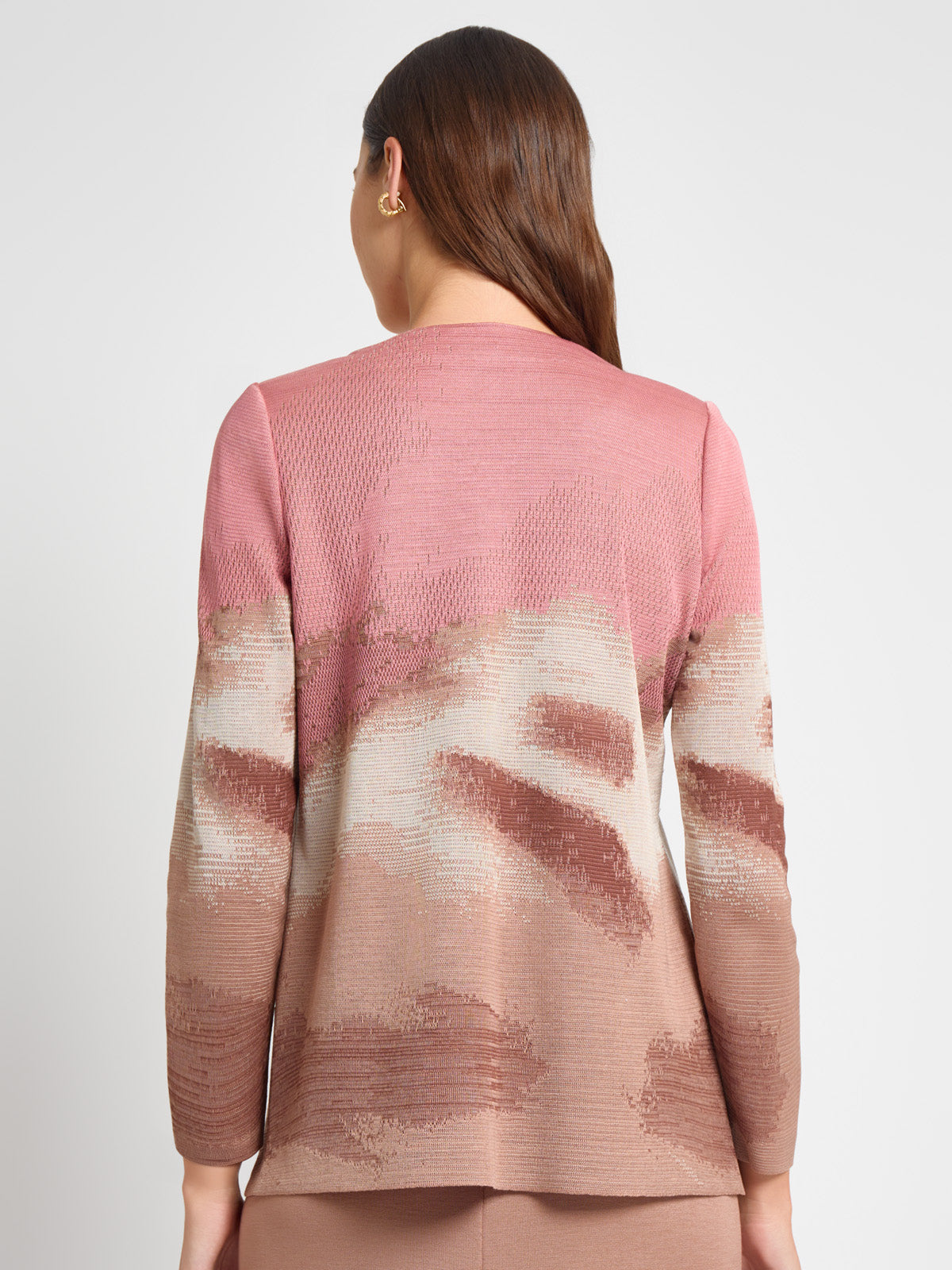 Crafted from wrinkle-resistant knit fabric, this jacket features a striking landscape pattern, adding a modern touch to a classic heritage silhouette. The jewel neck, hook-and-eye closure, and soft shoulder pads ensure a tailored and polished fit, while the long sleeves make this jacket perfect for layering year-round.