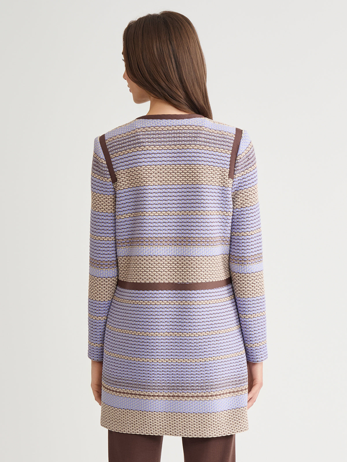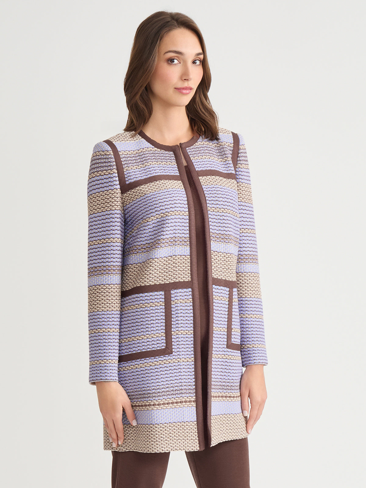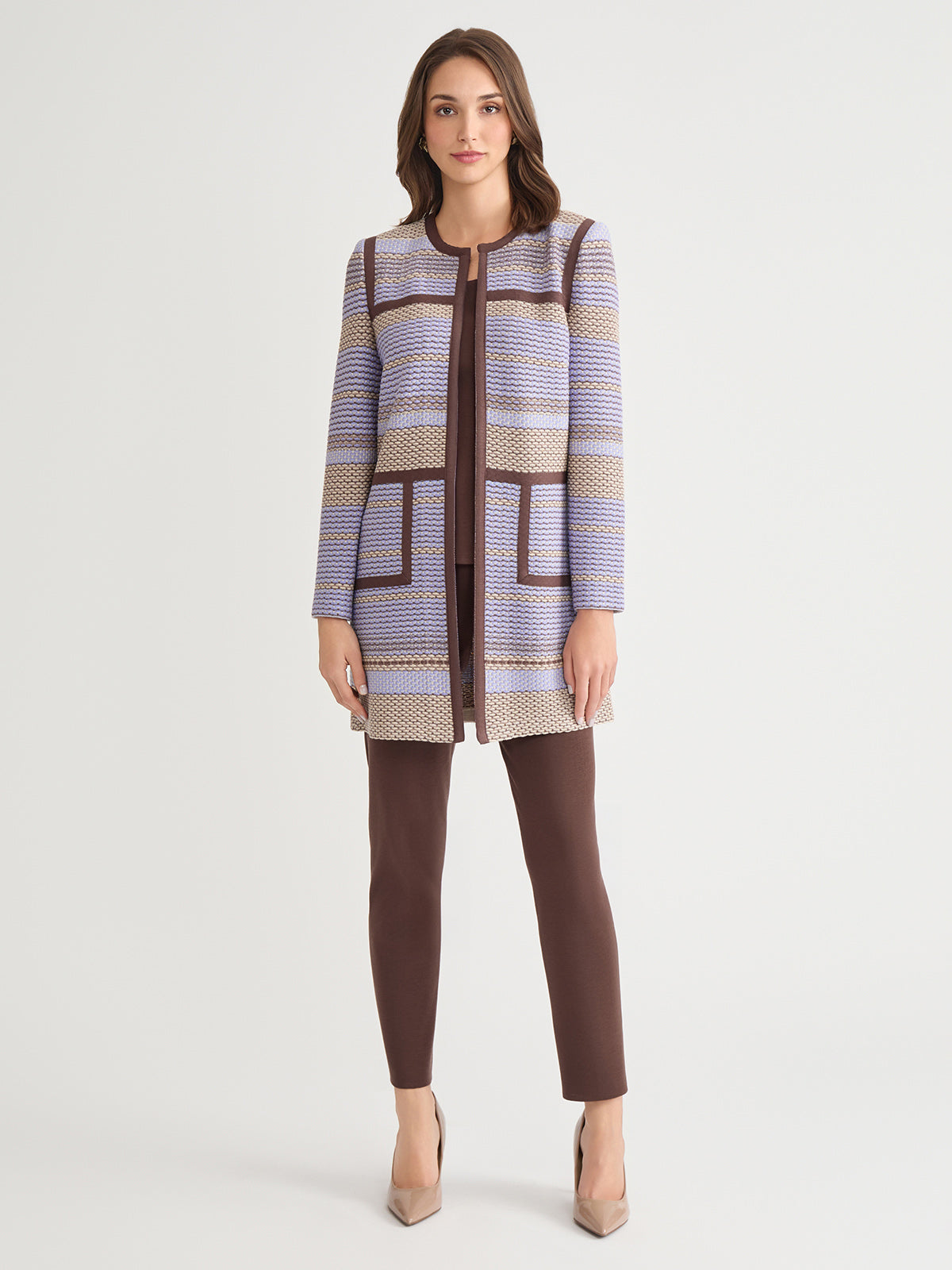 Enhance your work wardrobe with the Multi-Stitch Knit Jacket, a sophisticated piece designed for the modern professional who values both comfort and style. With a generous 32-inch length, this jacket provides a flattering, elongated silhouette, perfect for creating a sleek and polished look at the office or in any business setting. The jacket features contrasting knit trim, adding a bold yet refined touch to its classic design. The jewel neck offers a touch of elegance, while the hook and eye closure ensures a secure fit and smooth, streamlined appearance. Whether layered over a blouse or paired with a dress, this jacket seamlessly complements a variety of professional outfits.