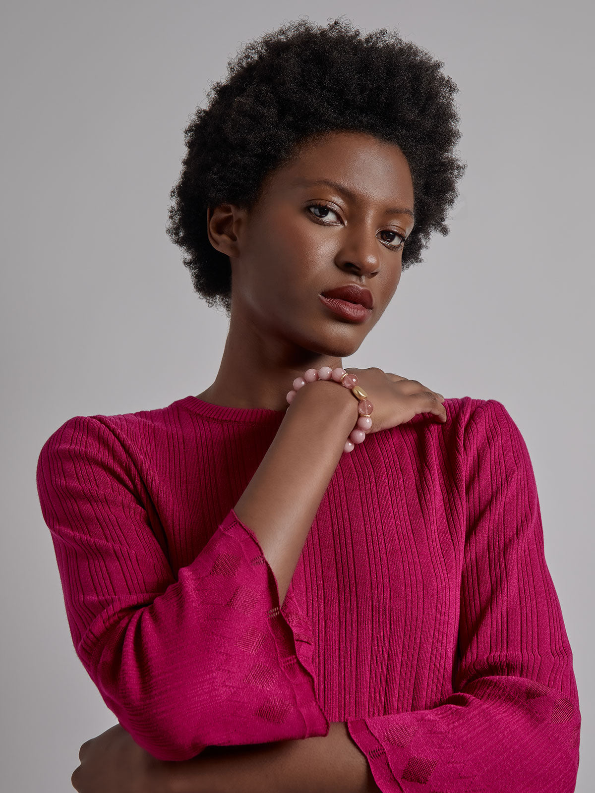Add a pop of color as a finishing touch to your next outfit. Our Melon Quarts Stretch Bracelet is made with sustainably sourced Melon Quartz, Peach Jade, and Pink Coral. All gold finishes are plated with 18K Matte Gold, ensuring you get years of wear without the fear of tarnishing.