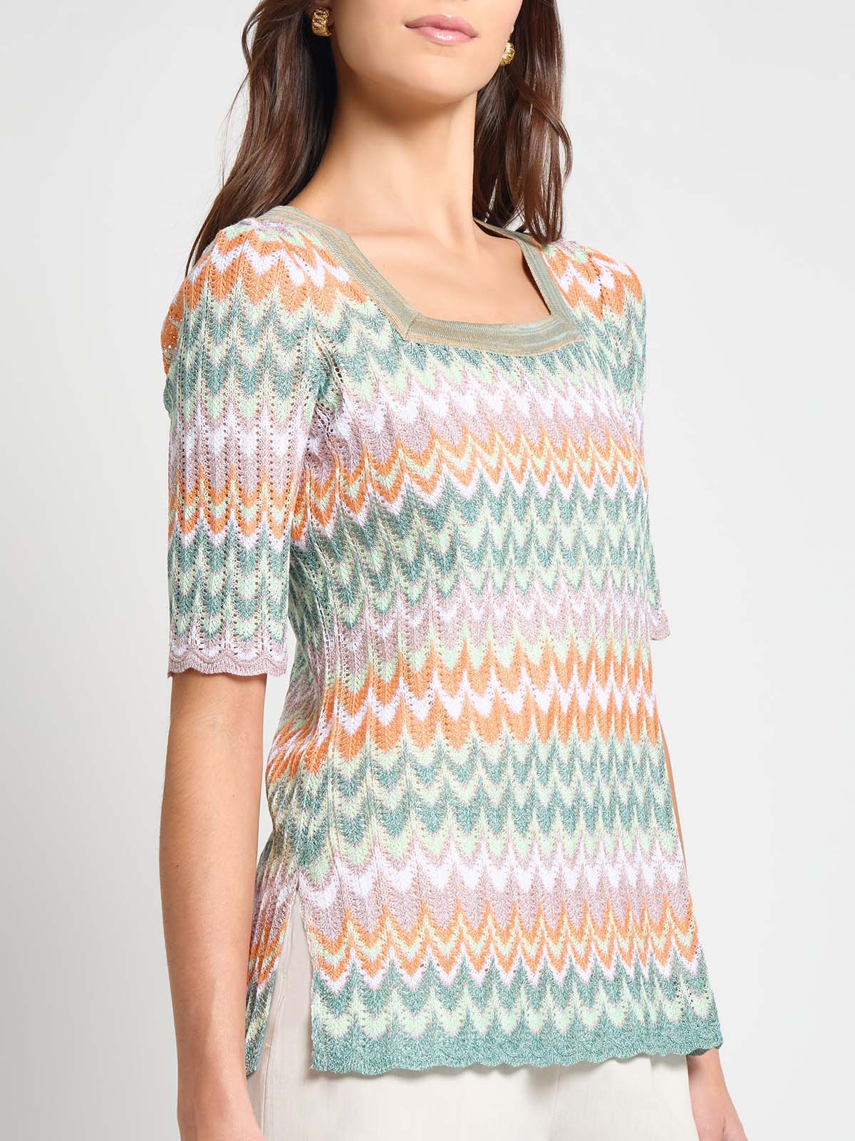 The Pointelle ZigZag Tunic is the perfect combination of comfort and style, designed to elevate your wardrobe with a unique appeal. Elbow-length sleeves provide the perfect amount of coverage, and the contrasting melange knit trim adds a unique, textured detail. Side slits complete the look, offering ease of movement and a chic, polished finish. Pair this knit tunic with a pair of our best selling knit pants or skirt options for a complete look.