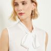 Complete any ensemble with the elegance of this button-front blouse, featuring a feminine tie neck, fabric-covered buttons, and a silky crepe de chine fabric. The back features a pleat for a stunning drape that works as well under a jacket as it does on its own.