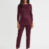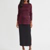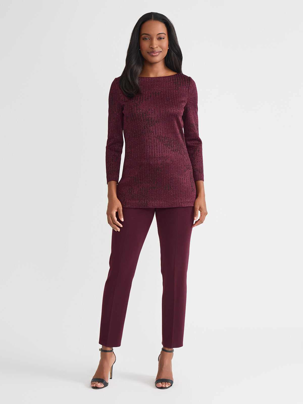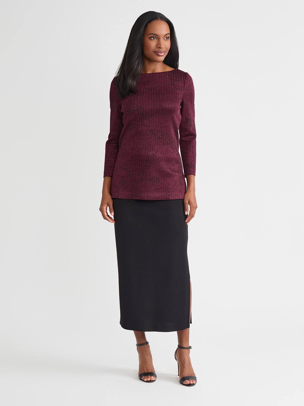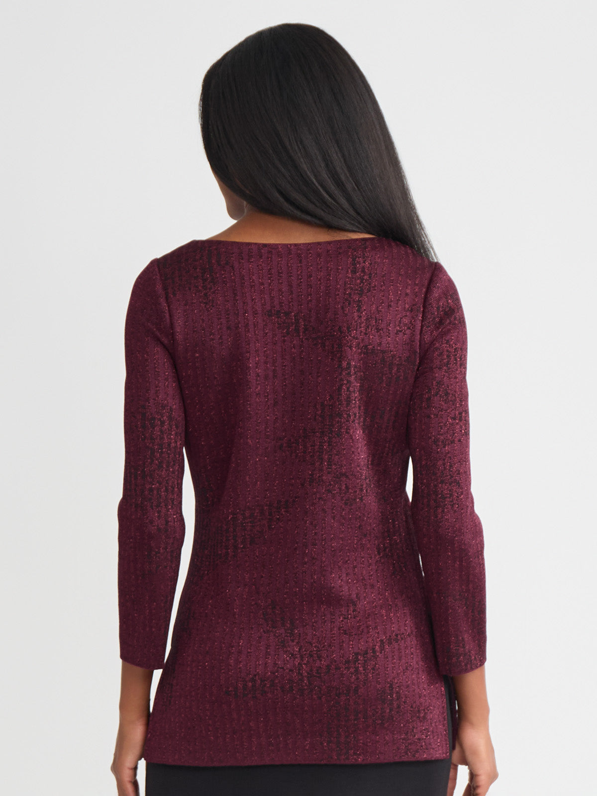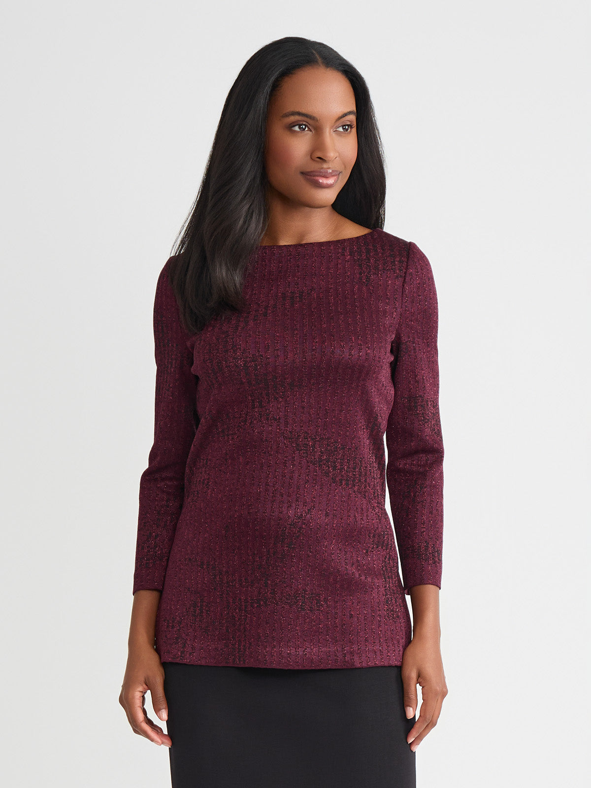 Slip into sophistication with this shimmer-knit tunic, where tonal patterning meets effortless allure. The rich sangria and black colorway creates a sultry contrast, while a delicate shimmer catches the light with every step. Designed with a graceful boat neckline and a relaxed pullover silhouette, it glides over the figure, finishing with deep side slits that add dramatic movement and modern ease. Perfect for soirées, artful evenings, or simply when you want your style to whisper elegance.